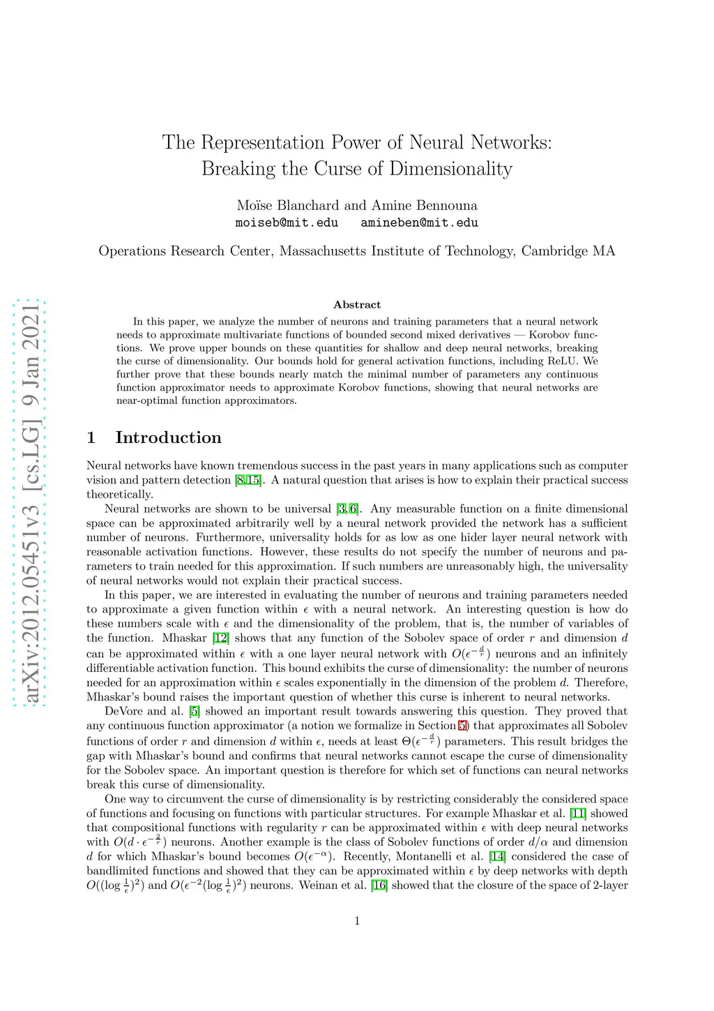In this paper, we analyze the number of neurons and training parameters that a neural networks needs to approximate multivariate functions of bounded second mixed derivatives -- Korobov functions. We prove upper bounds on these quantities for shallow and deep neural networks, breaking the curse of dimensionality. Our bounds hold for general activation functions, including ReLU. We further prove that these bounds nearly match the minimal number of parameters any continuous function approximator needs to approximate Korobov functions, showing that neural networks are near-optimal function approximators.