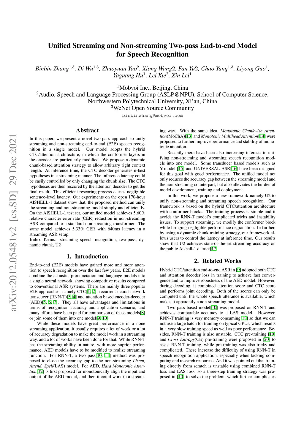 In this paper, we present a novel two-pass approach to unify streaming and non-streaming end-to-end (E2E) speech recognition in a single model. Our model adopts the hybrid CTC/attention architecture, in which the conformer layers in the encoder are modified. We propose a dynamic chunk-based attention strategy to allow arbitrary right context length. At inference time, the CTC decoder generates n-best hypotheses in a streaming way. The inference latency could be easily controlled by only changing the chunk size. The CTC hypotheses are then rescored by the attention decoder to get the final result. This efficient rescoring process causes very little sentence-level latency. Our experiments on the open 170-hour AISHELL-1 dataset show that, the proposed method can unify the streaming and non-streaming model simply and efficiently. On the AISHELL-1 test set, our unified model achieves 5.60% relative character error rate (CER) reduction in non-streaming ASR compared to a standard non-streaming transformer. The same model achieves 5.42% CER with 640ms latency in a streaming ASR system.