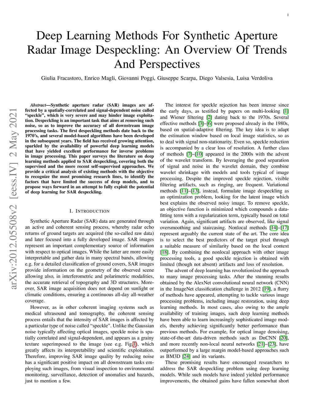 Deep Learning Methods For Synthetic Aperture Radar Image Despeckling: An