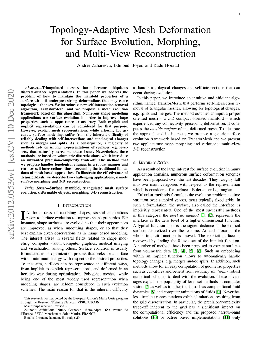 Triangulated meshes have become ubiquitous discrete-surface representations. In this paper we address the problem of how to maintain the manifold properties of a surface while it undergoes strong deformations that may cause topological changes. We introduce a new self-intersection removal algorithm, TransforMesh, and we propose a mesh evolution framework based on this algorithm. Numerous shape modelling applications use surface evolution in order to improve shape properties, such as appearance or accuracy. Both explicit and implicit representations can be considered for that purpose. However, explicit mesh representations, while allowing for accurate surface modelling, suffer from the inherent difficulty of reliably dealing with self-intersections and topological changes such as merges and splits. As a consequence, a majority of methods rely on implicit representations of surfaces, e.g. level-sets, that naturally overcome these issues. Nevertheless, these methods are based on volumetric discretizations, which introduce an unwanted precision-complexity trade-off. The method that we propose handles topological changes in a robust manner and removes self intersections, thus overcoming the traditional limitations of mesh-based approaches. To illustrate the effectiveness of TransforMesh, we describe two challenging applications, namely surface morphing and 3-D reconstruction.