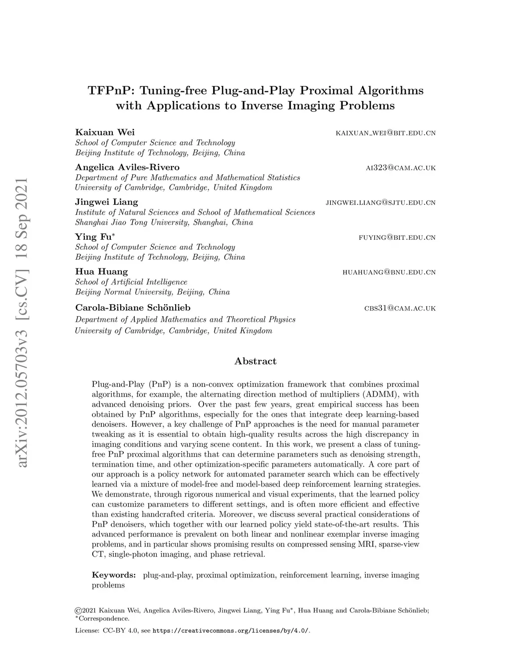TFPnP: Tuning-free Plug-and-Play Proximal Algorithm with Applications to