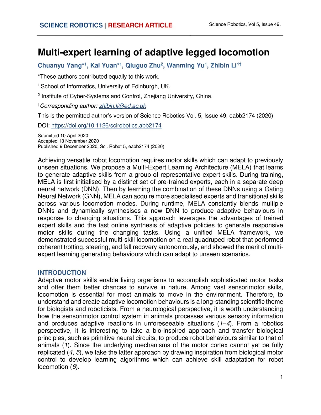Multi-expert learning of adaptive legged locomotion