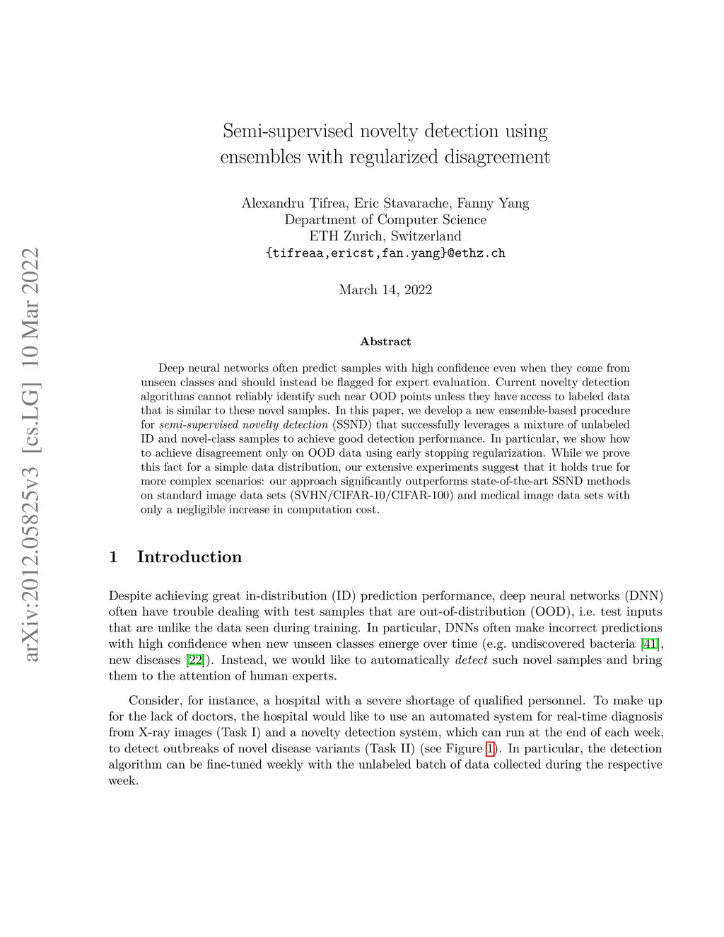 Deep neural networks often predict samples with high confidence even when they come from unseen classes and should instead be flagged for expert evaluation. Current novelty detection algorithms cannot reliably identify such near OOD points unless they have access to labeled data that is similar to these novel samples. In this paper, we develop a new ensemble-based procedure for semi-supervised novelty detection (SSND) that successfully leverages a mixture of unlabeled ID and novel-class samples to achieve good detection performance. In particular, we show how to achieve disagreement only on OOD data using early stopping regularization. While we prove this fact for a simple data distribution, our extensive experiments suggest that it holds true for more complex scenarios: our approach significantly outperforms state-of-the-art SSND methods on standard image data sets (SVHN/CIFAR-10/CIFAR-100) and medical image data sets with only a negligible increase in computation cost.