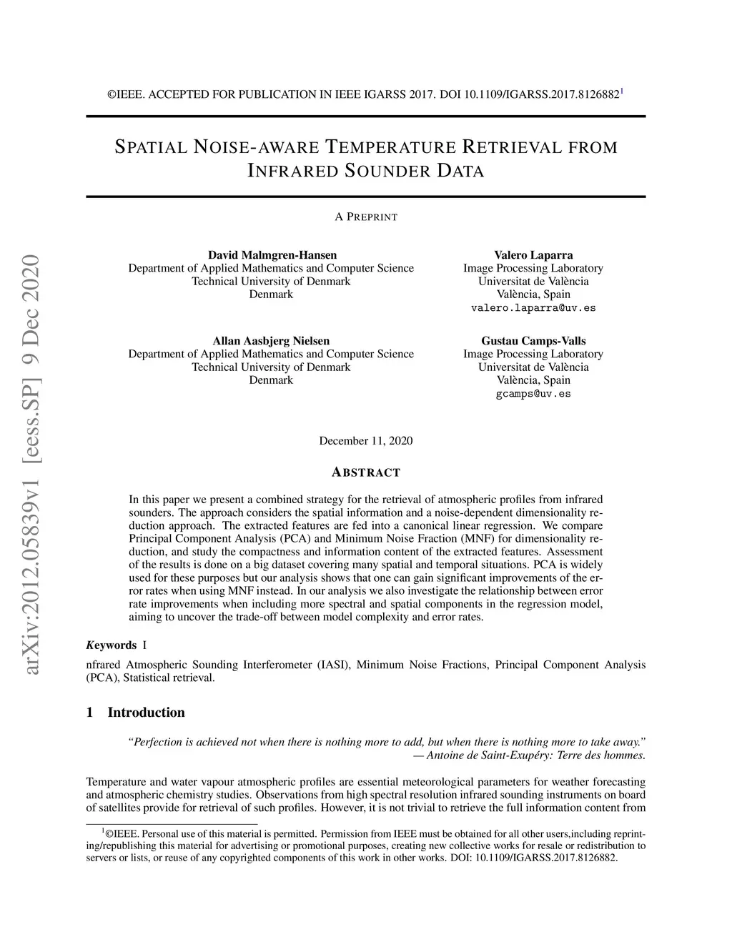 In this paper we present a combined strategy for the retrieval of atmospheric profiles from infrared sounders. The approach considers the spatial information and a noise-dependent dimensionality reduction approach. The extracted features are fed into a canonical linear regression. We compare Principal Component Analysis (PCA) and Minimum Noise Fraction (MNF) for dimensionality reduction, and study the compactness and information content of the extracted features. Assessment of the results is done on a big dataset covering many spatial and temporal situations. PCA is widely used for these purposes but our analysis shows that one can gain significant improvements of the error rates when using MNF instead. In our analysis we also investigate the relationship between error rate improvements when including more spectral and spatial components in the regression model, aiming to uncover the trade-off between model complexity and error rates.