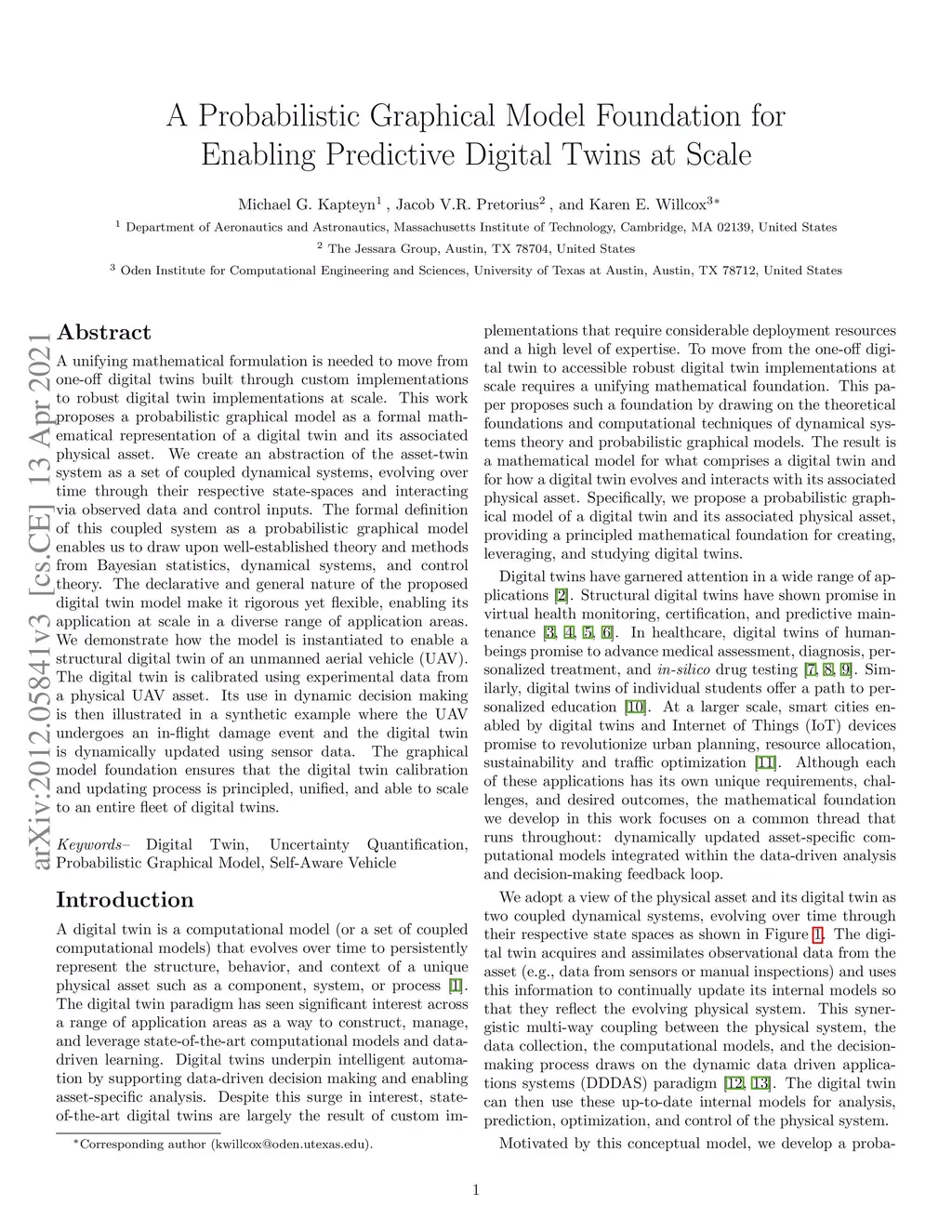 A unifying mathematical formulation is needed to move from one-off digital twins built through custom implementations to robust digital twin implementations at scale. This work proposes a probabilistic graphical model as a formal mathematical representation of a digital twin and its associated physical asset. We create an abstraction of the asset-twin system as a set of coupled dynamical systems, evolving over time through their respective state-spaces and interacting via observed data and control inputs. The formal definition of this coupled system as a probabilistic graphical model enables us to draw upon well-established theory and methods from Bayesian statistics, dynamical systems, and control theory. The declarative and general nature of the proposed digital twin model make it rigorous yet flexible, enabling its application at scale in a diverse range of application areas. We demonstrate how the model is instantiated to enable a structural digital twin of an unmanned aerial vehicle (UAV). The digital twin is calibrated using experimental data from a physical UAV asset. Its use in dynamic decision making is then illustrated in a synthetic example where the UAV undergoes an in-flight damage event and the digital twin is dynamically updated using sensor data. The graphical model foundation ensures that the digital twin calibration and updating process is principled, unified, and able to scale to an entire fleet of digital twins.