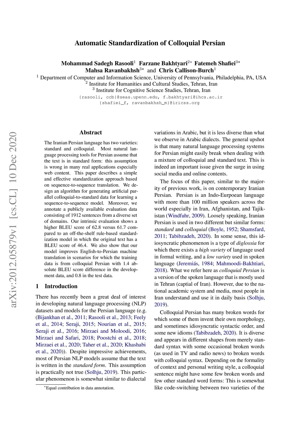 The Iranian Persian language has two varieties: standard and colloquial. Most natural language processing tools for Persian assume that the text is in standard form: this assumption is wrong in many real applications especially web content. This paper describes a simple and effective standardization approach based on sequence-to-sequence translation. We design an algorithm for generating artificial parallel colloquial-to-standard data for learning a sequence-to-sequence model. Moreover, we annotate a publicly available evaluation data consisting of 1912 sentences from a diverse set of domains. Our intrinsic evaluation shows a higher BLEU score of 62.8 versus 61.7 compared to an off-the-shelf rule-based standardization model in which the original text has a BLEU score of 46.4. We also show that our model improves English-to-Persian machine translation in scenarios for which the training data is from colloquial Persian with 1.4 absolute BLEU score difference in the development data, and 0.8 in the test data.