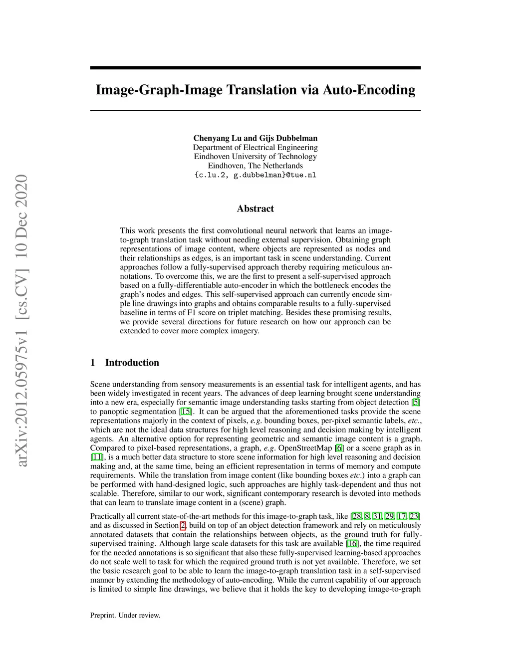 This work presents the first convolutional neural network that learns an image-to-graph translation task without needing external supervision. Obtaining graph representations of image content, where objects are represented as nodes and their relationships as edges, is an important task in scene understanding. Current approaches follow a fully-supervised approach thereby requiring meticulous annotations. To overcome this, we are the first to present a self-supervised approach based on a fully-differentiable auto-encoder in which the bottleneck encodes the graph's nodes and edges. This self-supervised approach can currently encode simple line drawings into graphs and obtains comparable results to a fully-supervised baseline in terms of F1 score on triplet matching. Besides these promising results, we provide several directions for future research on how our approach can be extended to cover more complex imagery.