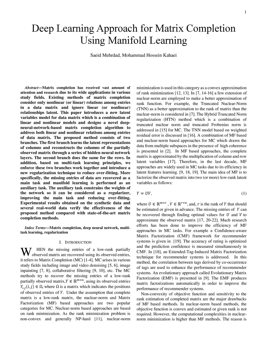 Matrix completion has received vast amount of attention and research due to its wide applications in various study fields. Existing methods of matrix completion consider only nonlinear (or linear) relations among entries in a data matrix and ignore linear (or nonlinear) relationships latent. This paper introduces a new latent variables model for data matrix which is a combination of linear and nonlinear models and designs a novel deep-neural-network-based matrix completion algorithm to address both linear and nonlinear relations among entries of data matrix. The proposed method consists of two branches. The first branch learns the latent representations of columns and reconstructs the columns of the partially observed matrix through a series of hidden neural network layers. The second branch does the same for the rows. In addition, based on multi-task learning principles, we enforce these two branches work together and introduce a new regularization technique to reduce over-fitting. More specifically, the missing entries of data are recovered as a main task and manifold learning is performed as an auxiliary task. The auxiliary task constrains the weights of the network so it can be considered as a regularizer, improving the main task and reducing over-fitting. Experimental results obtained on the synthetic data and several real-world data verify the effectiveness of the proposed method compared with state-of-the-art matrix completion methods.