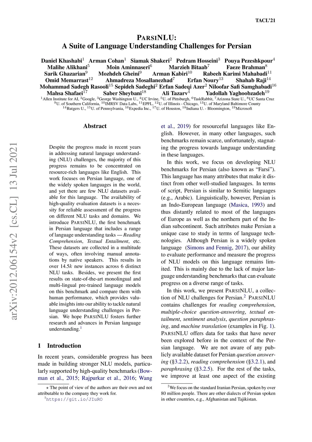 ParsiNLU: A Suite of Language Understanding Challenges for Persian