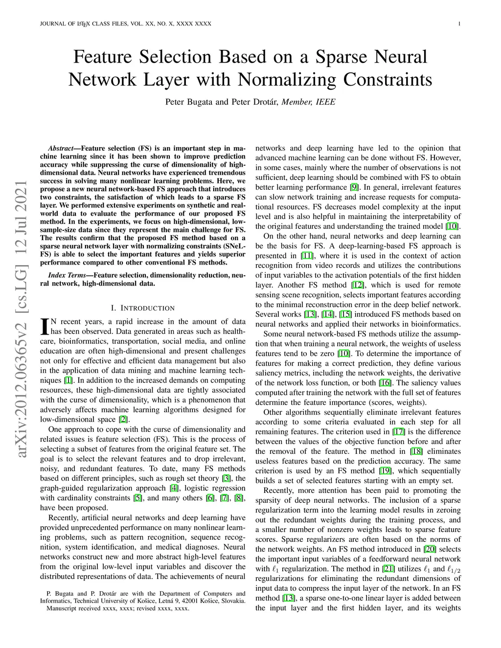 Feature selection is important step in machine learning since it has shown to improve prediction accuracy while depressing the curse of dimensionality of high dimensional data. The neural networks have experienced tremendous success in solving many nonlinear learning problems. Here, we propose new neural-network based feature selection approach that introduces two constrains, the satisfying of which leads to sparse FS layer. We have performed extensive experiments on synthetic and real world data to evaluate performance of the proposed FS. In experiments we focus on the high dimension, low sample size data since those represent the main challenge for feature selection. The results confirm that proposed Feature Selection Based on Sparse Neural Network Layer with Normalizing Constraints (SNEL-FS) is able to select the important features and yields superior performance compared to other conventional FS methods.