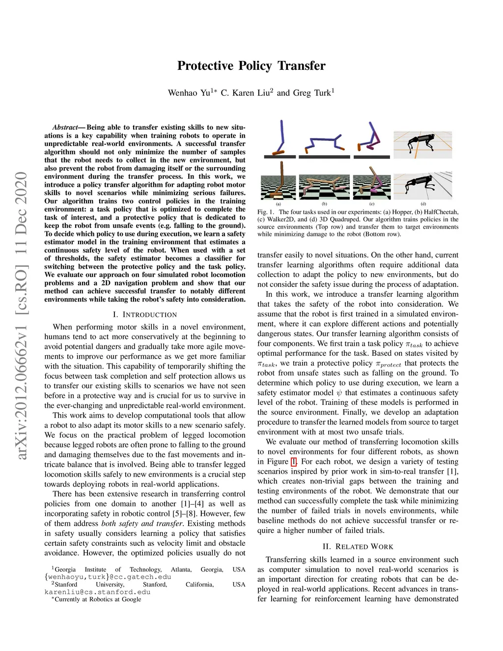 Being able to transfer existing skills to new situations is a key capability when training robots to operate in unpredictable real-world environments. A successful transfer algorithm should not only minimize the number of samples that the robot needs to collect in the new environment, but also prevent the robot from damaging itself or the surrounding environment during the transfer process. In this work, we introduce a policy transfer algorithm for adapting robot motor skills to novel scenarios while minimizing serious failures. Our algorithm trains two control policies in the training environment: a task policy that is optimized to complete the task of interest, and a protective policy that is dedicated to keep the robot from unsafe events (e.g. falling to the ground). To decide which policy to use during execution, we learn a safety estimator model in the training environment that estimates a continuous safety level of the robot. When used with a set of thresholds, the safety estimator becomes a classifier for switching between the protective policy and the task policy. We evaluate our approach on four simulated robot locomotion problems and a 2D navigation problem and show that our method can achieve successful transfer to notably different environments while taking the robot's safety into consideration.