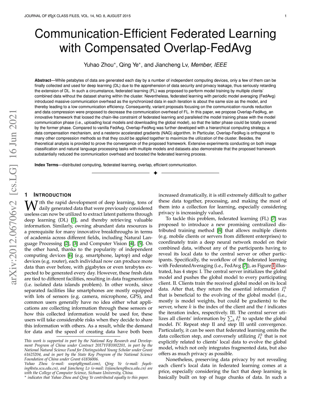 Petabytes of data are generated each day by emerging Internet of Things (IoT), but only few of them can be finally collected and used for Machine Learning (ML) purposes due to the apprehension of data & privacy leakage, which seriously retarding ML's growth. To alleviate this problem, Federated learning is proposed to perform model training by multiple clients' combined data without the dataset sharing within the cluster. Nevertheless, federated learning introduces massive communication overhead as the synchronized data in each epoch is of the same size as the model, and thereby leading to a low communication efficiency. Consequently, variant methods mainly focusing on the communication rounds reduction and data compression are proposed to reduce the communication overhead of federated learning. In this paper, we propose Overlap-FedAvg, a framework that parallels the model training phase with model uploading & downloading phase, so that the latter phase can be totally covered by the former phase. Compared to vanilla FedAvg, Overlap-FedAvg is further developed with a hierarchical computing strategy, a data compensation mechanism and a nesterov accelerated gradients~(NAG) algorithm. Besides, Overlap-FedAvg is orthogonal to many other compression methods so that they can be applied together to maximize the utilization of the cluster. Furthermore, the theoretical analysis is provided to prove the convergence of the proposed Overlap-FedAvg framework. Extensive experiments on both conventional and recurrent tasks with multiple models and datasets also demonstrate that the proposed Overlap-FedAvg framework substantially boosts the federated learning process.