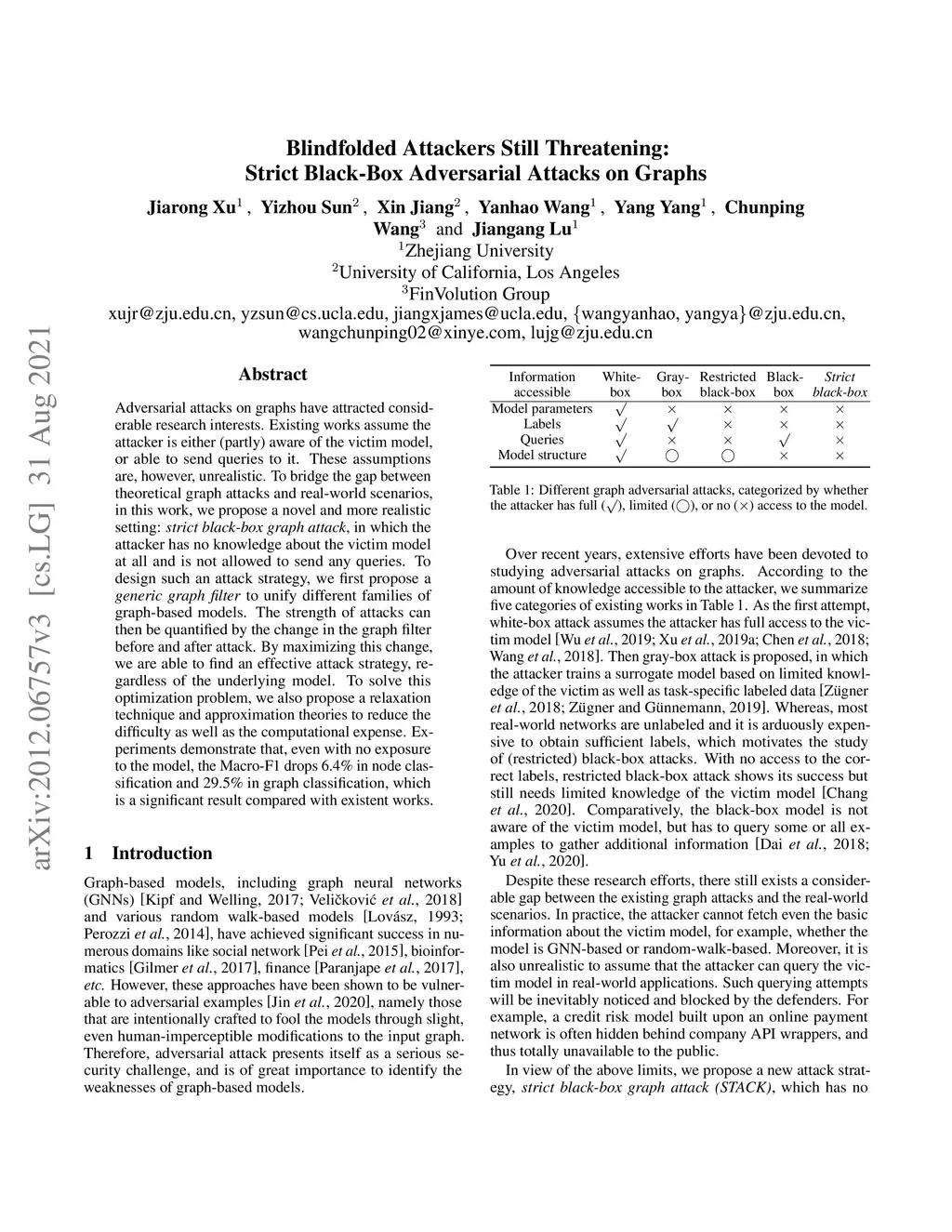Adversarial attacks on graphs have attracted considerable research interests. Existing works assume the attacker is either (partly) aware of the victim model, or able to send queries to it. These assumptions are, however, unrealistic. To bridge the gap between theoretical graph attacks and real-world scenarios, in this work, we propose a novel and more realistic setting: strict black-box graph attack, in which the attacker has no knowledge about the victim model at all and is not allowed to send any queries. To design such an attack strategy, we first propose a generic graph filter to unify different families of graph-based models. The strength of attacks can then be quantified by the change in the graph filter before and after attack. By maximizing this change, we are able to find an effective attack strategy, regardless of the underlying model. To solve this optimization problem, we also propose a relaxation technique and approximation theories to reduce the difficulty as well as the computational expense. Experiments demonstrate that, even with no exposure to the model, the Macro-F1 drops 6.4% in node classification and 29.5% in graph classification, which is a significant result compared with existent works.