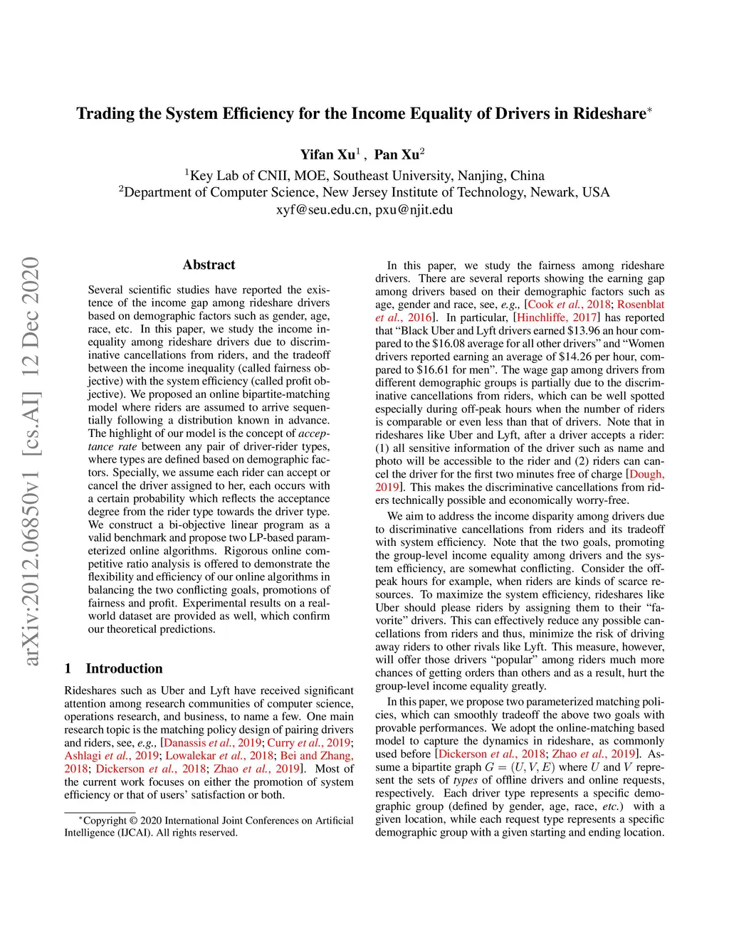 Trading the System Efficiency for the Income Equality of Drivers in