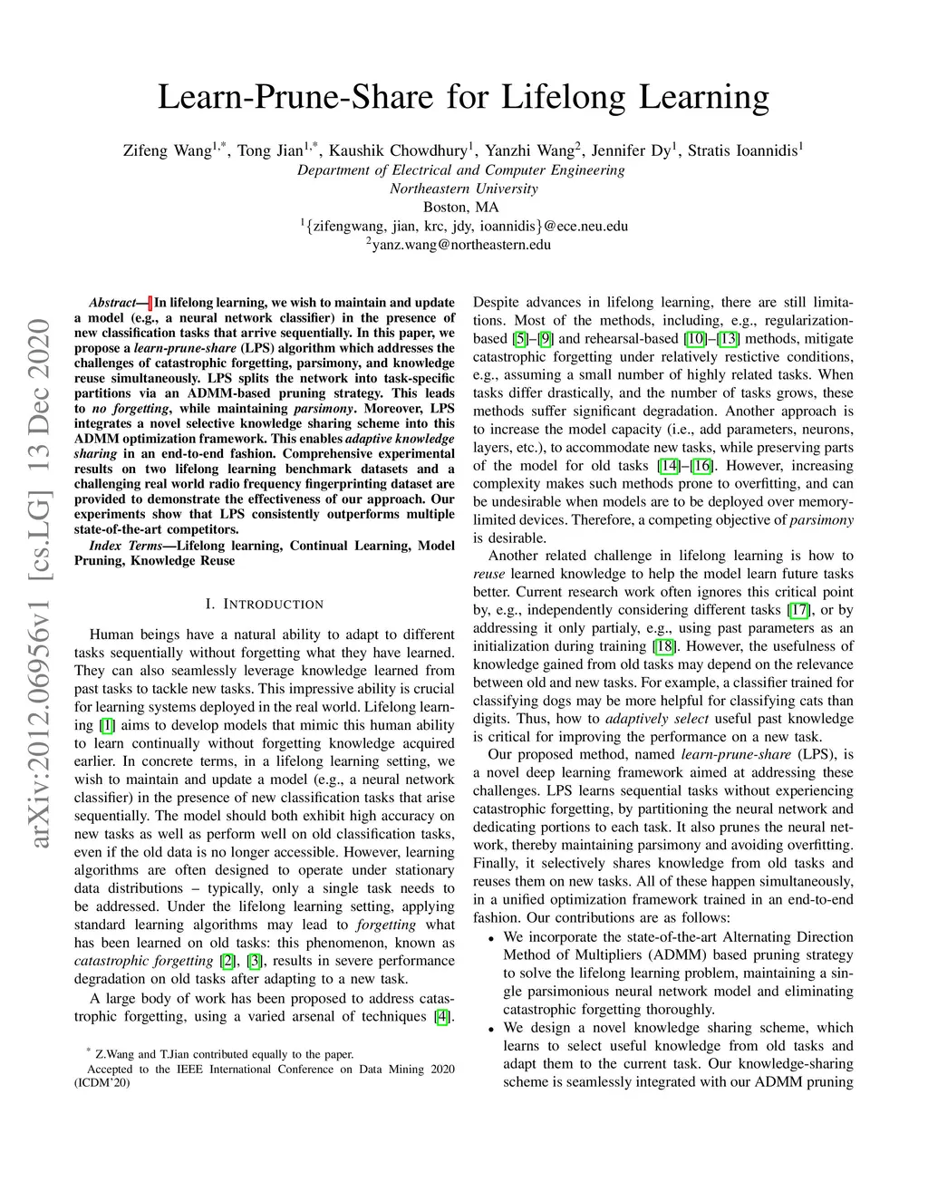 In lifelong learning, we wish to maintain and update a model (e.g., a neural network classifier) in the presence of new classification tasks that arrive sequentially. In this paper, we propose a learn-prune-share (LPS) algorithm which addresses the challenges of catastrophic forgetting, parsimony, and knowledge reuse simultaneously. LPS splits the network into task-specific partitions via an ADMM-based pruning strategy. This leads to no forgetting, while maintaining parsimony. Moreover, LPS integrates a novel selective knowledge sharing scheme into this ADMM optimization framework. This enables adaptive knowledge sharing in an end-to-end fashion. Comprehensive experimental results on two lifelong learning benchmark datasets and a challenging real-world radio frequency fingerprinting dataset are provided to demonstrate the effectiveness of our approach. Our experiments show that LPS consistently outperforms multiple state-of-the-art competitors.
