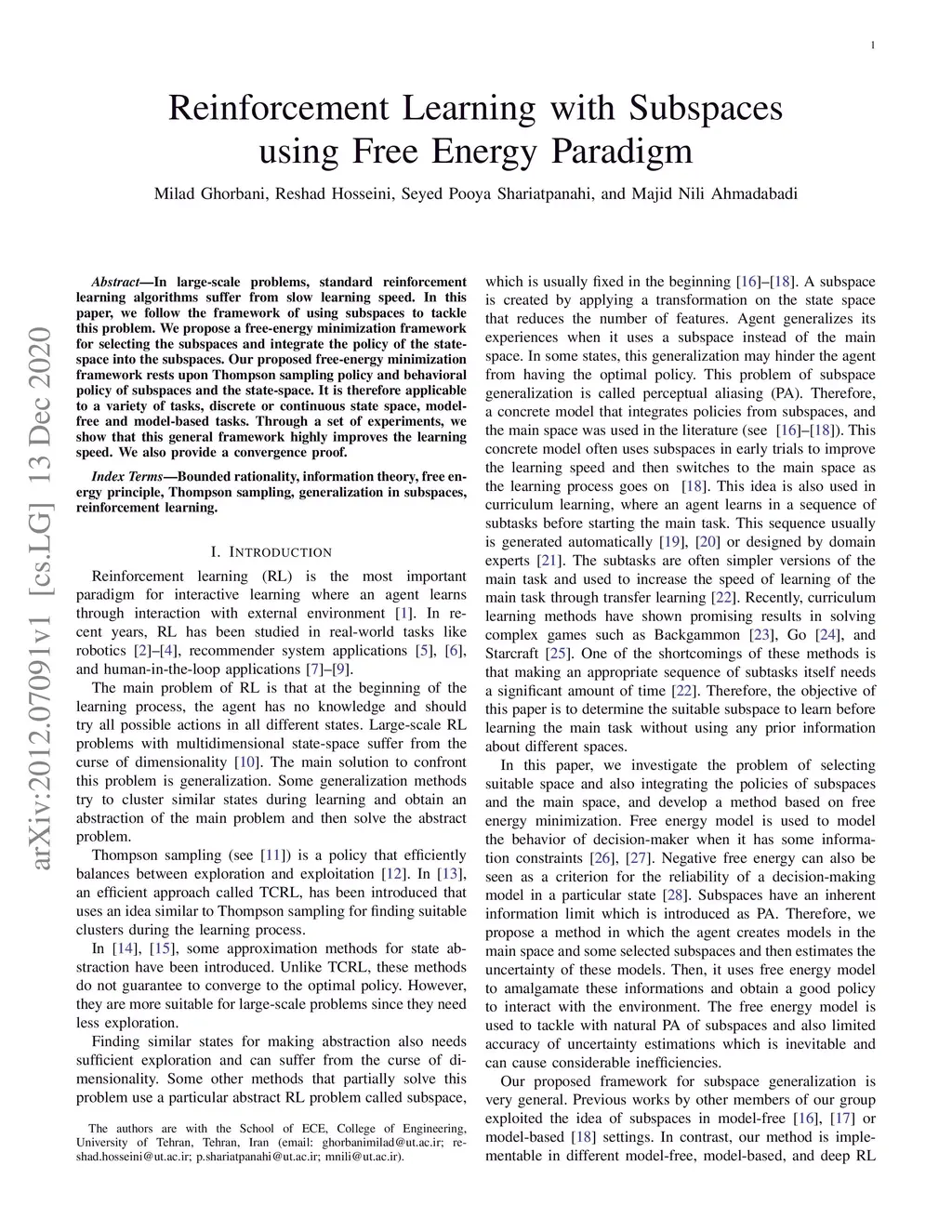 Reinforcement Learning with Subspaces using Free Energy Paradigm