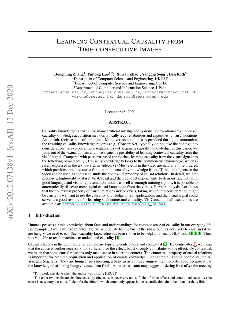 Causality knowledge is crucial for many artificial intelligence systems. Conventional textual-based causality knowledge acquisition methods typically require laborious and expensive human annotations. As a result, their scale is often limited. Moreover, as no context is provided during the annotation, the resulting causality knowledge records (e.g., ConceptNet) typically do not take the context into consideration. To explore a more scalable way of acquiring causality knowledge, in this paper, we jump out of the textual domain and investigate the possibility of learning contextual causality from the visual signal. Compared with pure text-based approaches, learning causality from the visual signal has the following advantages: (1) Causality knowledge belongs to the commonsense knowledge, which is rarely expressed in the text but rich in videos; (2) Most events in the video are naturally time-ordered, which provides a rich resource for us to mine causality knowledge from; (3) All the objects in the video can be used as context to study the contextual property of causal relations. In detail, we first propose a high-quality dataset Vis-Causal and then conduct experiments to demonstrate that with good language and visual representation models as well as enough training signals, it is possible to automatically discover meaningful causal knowledge from the videos. Further analysis also shows that the contextual property of causal relations indeed exists, taking which into consideration might be crucial if we want to use the causality knowledge in real applications, and the visual signal could serve as a good resource for learning such contextual causality.
