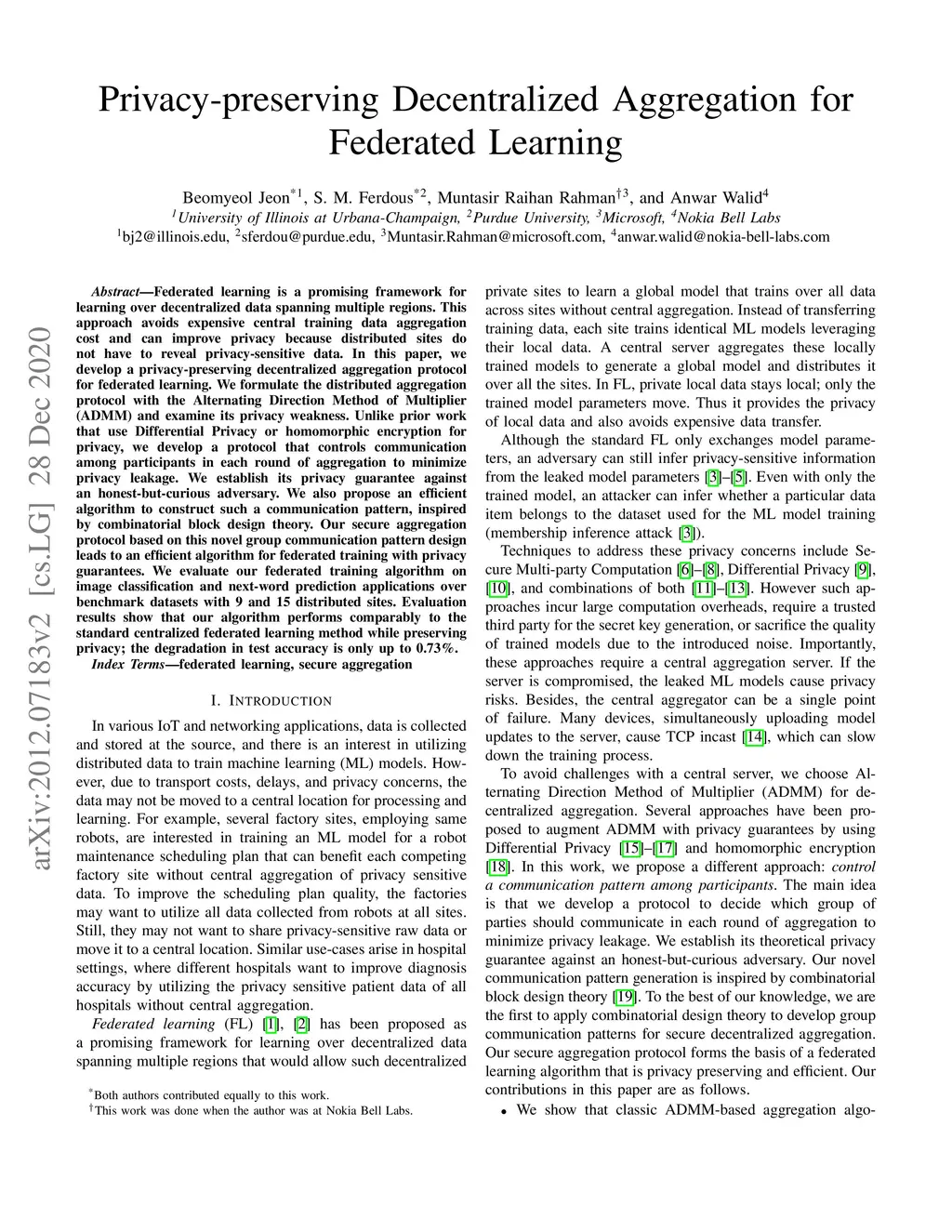 Federated learning is a promising framework for learning over decentralized data spanning multiple regions. This approach avoids expensive central training data aggregation cost and can improve privacy because distributed sites do not have to reveal privacy-sensitive data. In this paper, we develop a privacy-preserving decentralized aggregation protocol for federated learning. We formulate the distributed aggregation protocol with the Alternating Direction Method of Multiplier (ADMM) and examine its privacy weakness. Unlike prior work that use Differential Privacy or homomorphic encryption for privacy, we develop a protocol that controls communication among participants in each round of aggregation to minimize privacy leakage. We establish its privacy guarantee against an honest-but-curious adversary. We also propose an efficient algorithm to construct such a communication pattern, inspired by combinatorial block design theory. Our secure aggregation protocol based on this novel group communication pattern design leads to an efficient algorithm for federated training with privacy guarantees. We evaluate our federated training algorithm on image classification and next-word prediction applications over benchmark datasets with 9 and 15 distributed sites. Evaluation results show that our algorithm performs comparably to the standard centralized federated learning method while preserving privacy; the degradation in test accuracy is only up to 0.73%.