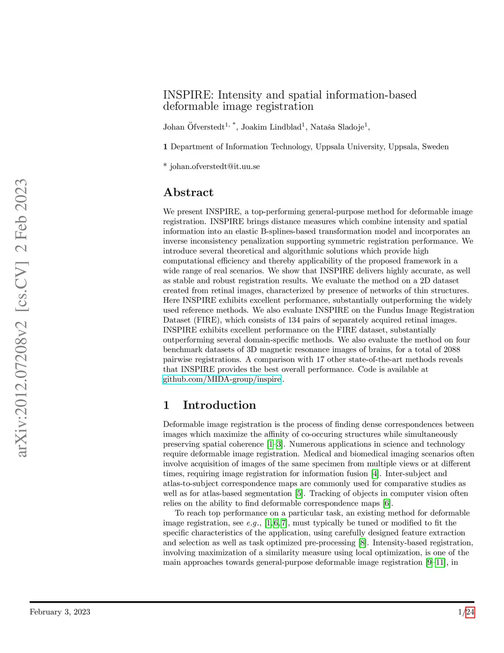 We present INSPIRE, a top-performing general-purpose method for deformable image registration. INSPIRE brings distance measures which combine intensity and spatial information into an elastic B-splines-based transformation model and incorporates an inverse inconsistency penalization supporting symmetric registration performance. We introduce several theoretical and algorithmic solutions which provide high computational efficiency and thereby applicability of the proposed framework in a wide range of real scenarios. We show that INSPIRE delivers highly accurate, as well as stable and robust registration results. We evaluate the method on a 2D dataset created from retinal images, characterized by presence of networks of thin structures. Here INSPIRE exhibits excellent performance, substantially outperforming the widely used reference methods. {We also evaluate INSPIRE on the Fundus Image Registration Dataset (FIRE), which consists of 134 pairs of separately acquired retinal images. INSPIRE exhibits excellent performance on the FIRE dataset, substantially outperforming several domain-specific methods.} We also evaluate the method on four benchmark datasets of 3D magnetic resonance images of brains, for a total of 2088 pairwise registrations. A comparison with 17 other state-of-the-art methods reveals that INSPIRE provides the best overall performance. Code is available at http://github.com/MIDA-group/inspire