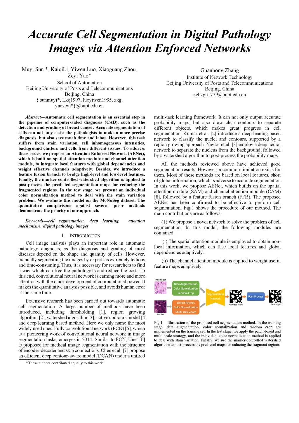 Automatic cell segmentation is an essential step in the pipeline of computer-aided diagnosis (CAD), such as the detection and grading of breast cancer. Accurate segmentation of cells can not only assist the pathologists to make a more precise diagnosis, but also save much time and labor. However, this task suffers from stain variation, cell inhomogeneous intensities, background clutters and cells from different tissues. To address these issues, we propose an Attention Enforced Network (AENet), which is built on spatial attention module and channel attention module, to integrate local features with global dependencies and weight effective channels adaptively. Besides, we introduce a feature fusion branch to bridge high-level and low-level features. Finally, the marker controlled watershed algorithm is applied to post-process the predicted segmentation maps for reducing the fragmented regions. In the test stage, we present an individual color normalization method to deal with the stain variation problem. We evaluate this model on the MoNuSeg dataset. The quantitative comparisons against several prior methods demonstrate the superiority of our approach.