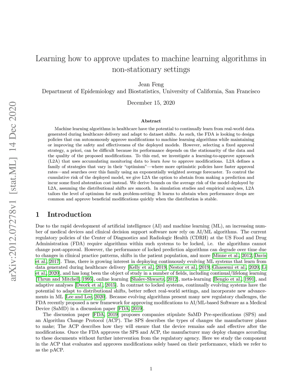 Machine learning algorithms in healthcare have the potential to continually learn from real-world data generated during healthcare delivery and adapt to dataset shifts. As such, the FDA is looking to design policies that can autonomously approve modifications to machine learning algorithms while maintaining or improving the safety and effectiveness of the deployed models. However, selecting a fixed approval strategy, a priori, can be difficult because its performance depends on the stationarity of the data and the quality of the proposed modifications. To this end, we investigate a learning-to-approve approach (L2A) that uses accumulating monitoring data to learn how to approve modifications. L2A defines a family of strategies that vary in their "optimism''---where more optimistic policies have faster approval rates---and searches over this family using an exponentially weighted average forecaster. To control the cumulative risk of the deployed model, we give L2A the option to abstain from making a prediction and incur some fixed abstention cost instead. We derive bounds on the average risk of the model deployed by L2A, assuming the distributional shifts are smooth. In simulation studies and empirical analyses, L2A tailors the level of optimism for each problem-setting: It learns to abstain when performance drops are common and approve beneficial modifications quickly when the distribution is stable.