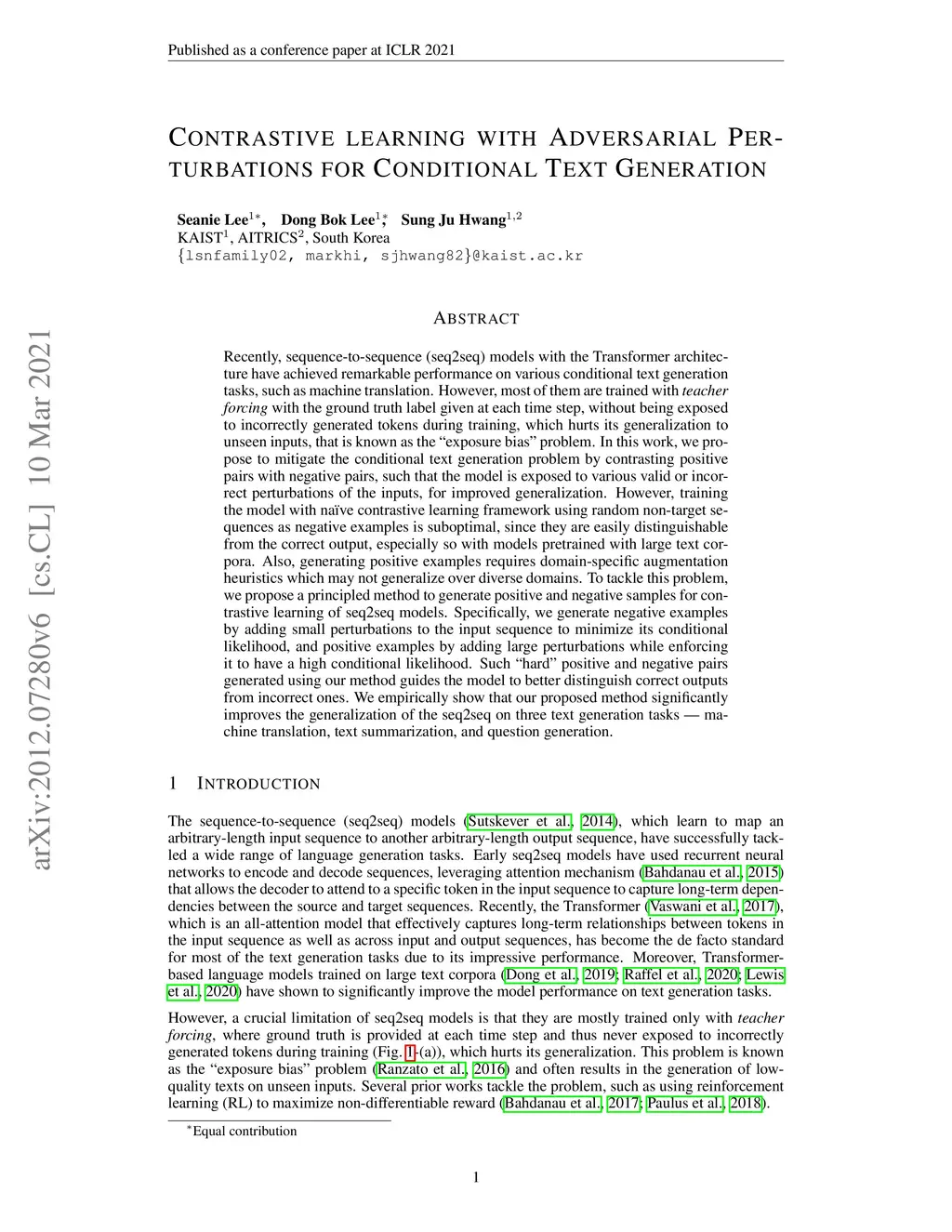 Contrastive Learning with Adversarial Perturbations for Conditional Text