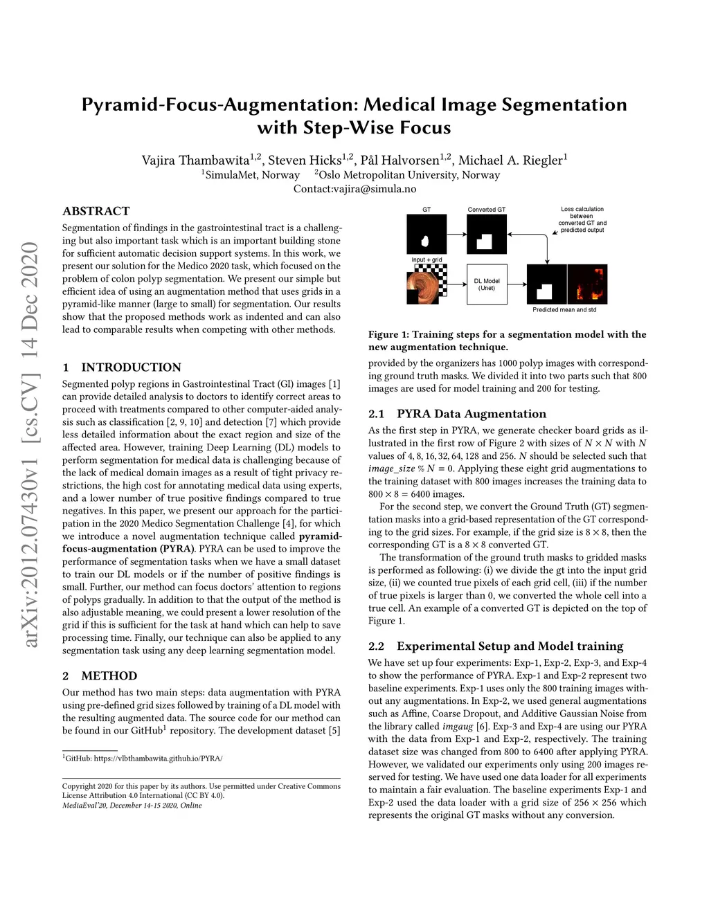 Segmentation of findings in the gastrointestinal tract is a challenging but also an important task which is an important building stone for sufficient automatic decision support systems. In this work, we present our solution for the Medico 2020 task, which focused on the problem of colon polyp segmentation. We present our simple but efficient idea of using an augmentation method that uses grids in a pyramid-like manner (large to small) for segmentation. Our results show that the proposed methods work as indented and can also lead to comparable results when competing with other methods.