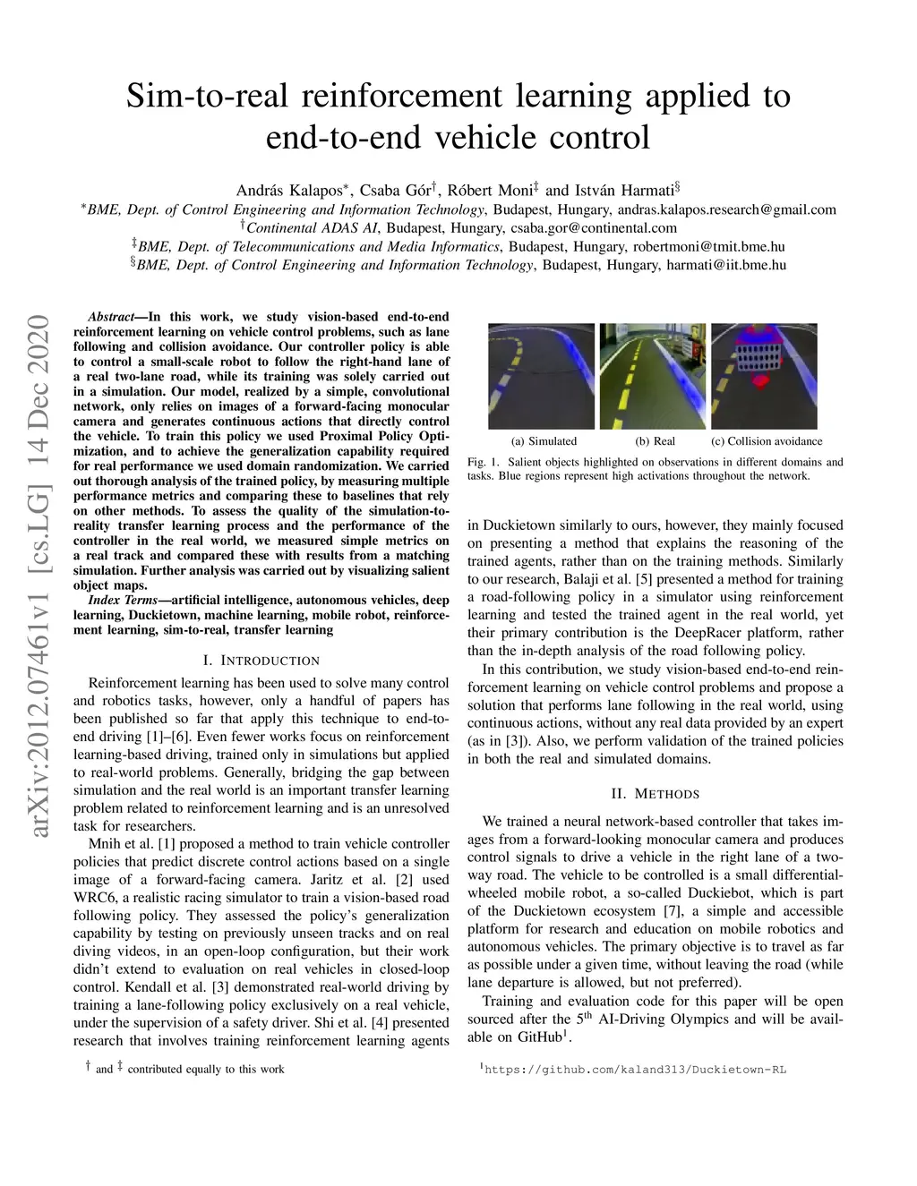 In this work, we study vision-based end-to-end reinforcement learning on vehicle control problems, such as lane following and collision avoidance. Our controller policy is able to control a small-scale robot to follow the right-hand lane of a real two-lane road, while its training was solely carried out in a simulation. Our model, realized by a simple, convolutional network, only relies on images of a forward-facing monocular camera and generates continuous actions that directly control the vehicle. To train this policy we used Proximal Policy Optimization, and to achieve the generalization capability required for real performance we used domain randomization. We carried out thorough analysis of the trained policy, by measuring multiple performance metrics and comparing these to baselines that rely on other methods. To assess the quality of the simulation-to-reality transfer learning process and the performance of the controller in the real world, we measured simple metrics on a real track and compared these with results from a matching simulation. Further analysis was carried out by visualizing salient object maps.