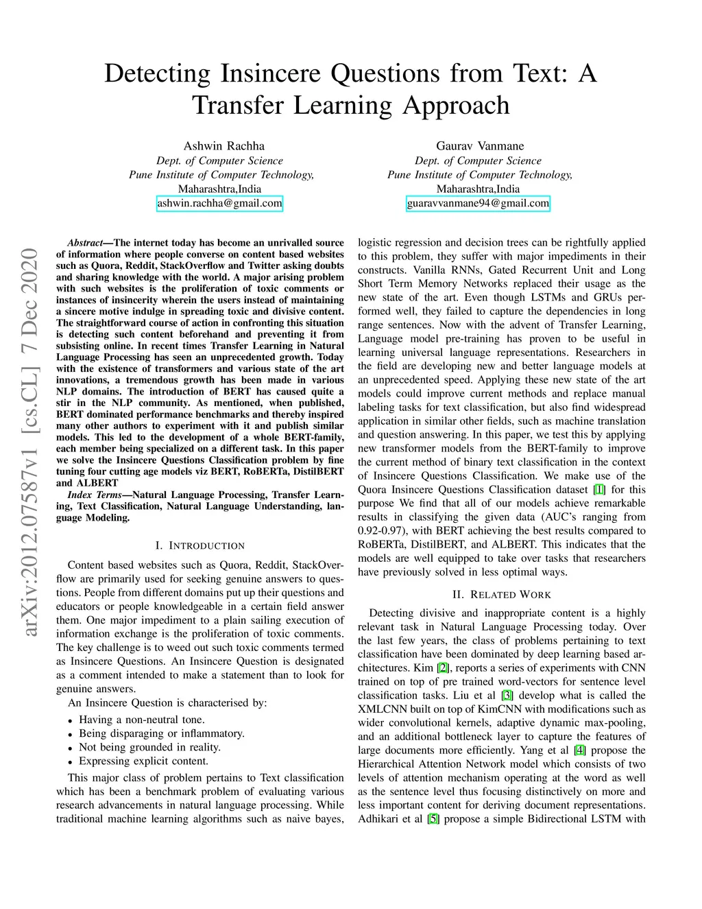 The internet today has become an unrivalled source of information where people converse on content based websites such as Quora, Reddit, StackOverflow and Twitter asking doubts and sharing knowledge with the world. A major arising problem with such websites is the proliferation of toxic comments or instances of insincerity wherein the users instead of maintaining a sincere motive indulge in spreading toxic and divisive content. The straightforward course of action in confronting this situation is detecting such content beforehand and preventing it from subsisting online. In recent times Transfer Learning in Natural Language Processing has seen an unprecedented growth. Today with the existence of transformers and various state of the art innovations, a tremendous growth has been made in various NLP domains. The introduction of BERT has caused quite a stir in the NLP community. As mentioned, when published, BERT dominated performance benchmarks and thereby inspired many other authors to experiment with it and publish similar models. This led to the development of a whole BERT-family, each member being specialized on a different task. In this paper we solve the Insincere Questions Classification problem by fine tuning four cutting age models viz BERT, RoBERTa, DistilBERT and ALBERT.
