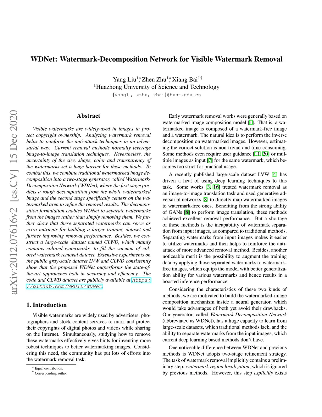 WDNet: Watermark-Decomposition Network for Visible Watermark Removal