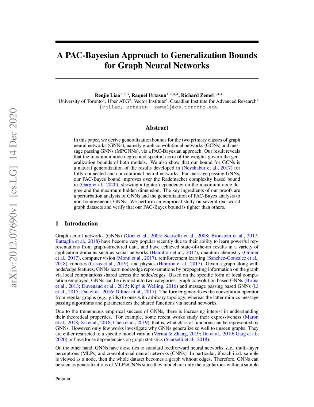 In this paper, we derive generalization bounds for the two primary classes of graph neural networks (GNNs), namely graph convolutional networks (GCNs) and message passing GNNs (MPGNNs), via a PAC-Bayesian approach. Our result reveals that the maximum node degree and spectral norm of the weights govern the generalization bounds of both models. We also show that our bound for GCNs is a natural generalization of the results developed in arXiv:1707.09564v2 [cs.LG] for fully-connected and convolutional neural networks. For message passing GNNs, our PAC-Bayes bound improves over the Rademacher complexity based bound in arXiv:2002.06157v1 [cs.LG], showing a tighter dependency on the maximum node degree and the maximum hidden dimension. The key ingredients of our proofs are a perturbation analysis of GNNs and the generalization of PAC-Bayes analysis to non-homogeneous GNNs. We perform an empirical study on several real-world graph datasets and verify that our PAC-Bayes bound is tighter than others.