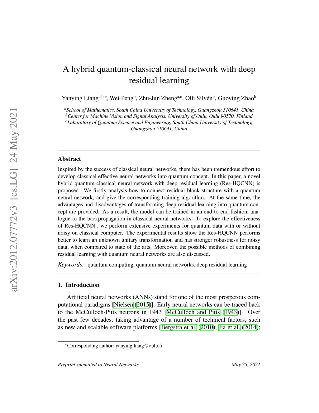 A hybrid quantum-classical neural network with deep residual learning