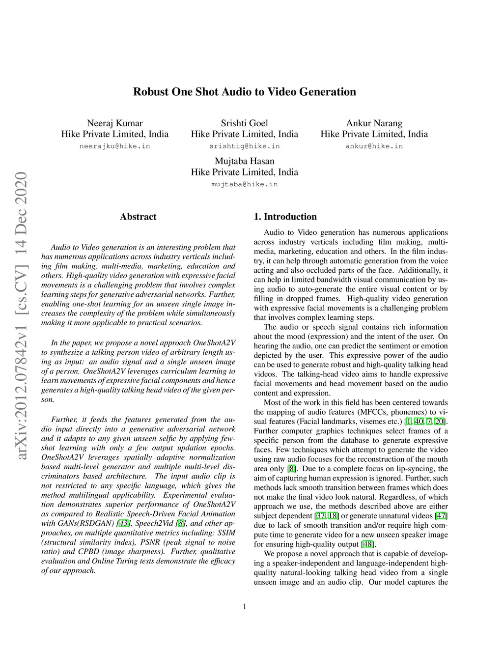 Audio to Video generation is an interesting problem that has numerous applications across industry verticals including film making, multi-media, marketing, education and others. High-quality video generation with expressive facial movements is a challenging problem that involves complex learning steps for generative adversarial networks. Further, enabling one-shot learning for an unseen single image increases the complexity of the problem while simultaneously making it more applicable to practical scenarios. In the paper, we propose a novel approach OneShotA2V to synthesize a talking person video of arbitrary length using as input: an audio signal and a single unseen image of a person. OneShotA2V leverages curriculum learning to learn movements of expressive facial components and hence generates a high-quality talking-head video of the given person. Further, it feeds the features generated from the audio input directly into a generative adversarial network and it adapts to any given unseen selfie by applying fewshot learning with only a few output updation epochs. OneShotA2V leverages spatially adaptive normalization based multi-level generator and multiple multi-level discriminators based architecture. The input audio clip is not restricted to any specific language, which gives the method multilingual applicability. Experimental evaluation demonstrates superior performance of OneShotA2V as compared to Realistic Speech-Driven Facial Animation with GANs(RSDGAN) [43], Speech2Vid [8], and other approaches, on multiple quantitative metrics including: SSIM (structural similarity index), PSNR (peak signal to noise ratio) and CPBD (image sharpness). Further, qualitative evaluation and Online Turing tests demonstrate the efficacy of our approach.