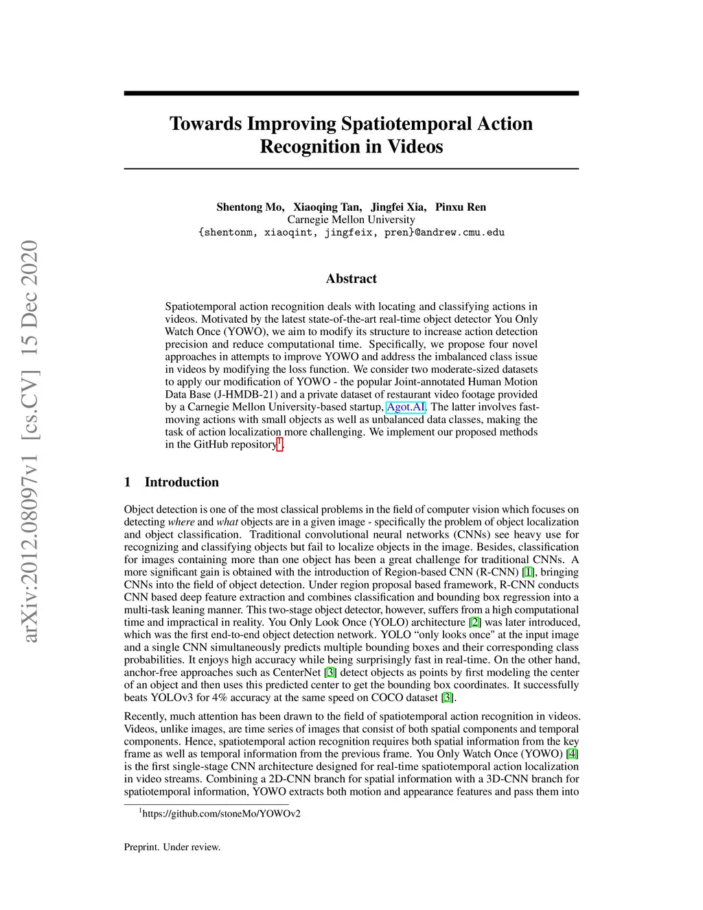 Spatiotemporal action recognition deals with locating and classifying actions in videos. Motivated by the latest state-of-the-art real-time object detector You Only Watch Once (YOWO), we aim to modify its structure to increase action detection precision and reduce computational time. Specifically, we propose four novel approaches in attempts to improve YOWO and address the imbalanced class issue in videos by modifying the loss function. We consider two moderate-sized datasets to apply our modification of YOWO - the popular Joint-annotated Human Motion Data Base (J-HMDB-21) and a private dataset of restaurant video footage provided by a Carnegie Mellon University-based startup, Agot.AI. The latter involves fast-moving actions with small objects as well as unbalanced data classes, making the task of action localization more challenging. We implement our proposed methods in the GitHub repository https://github.com/stoneMo/YOWOv2.