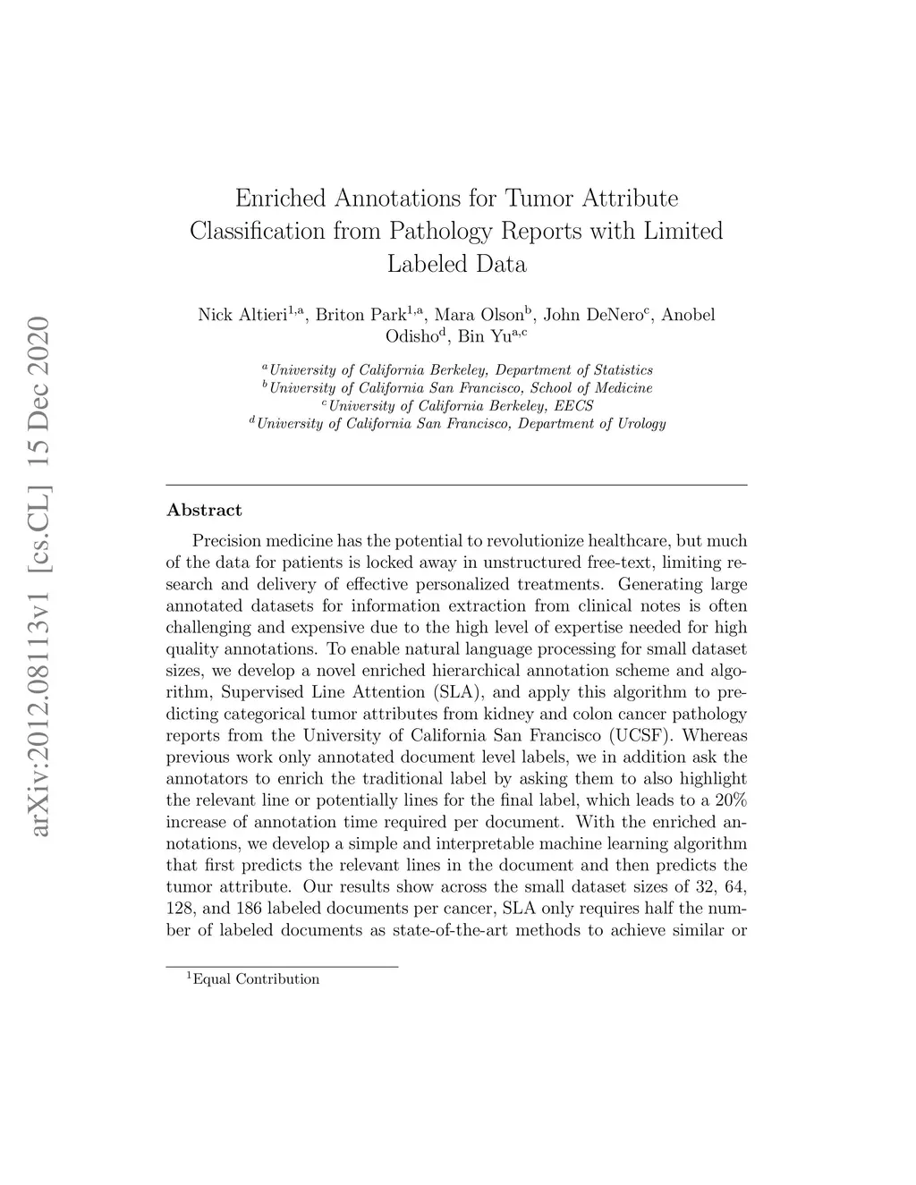 Precision medicine has the potential to revolutionize healthcare, but much of the data for patients is locked away in unstructured free-text, limiting research and delivery of effective personalized treatments. Generating large annotated datasets for information extraction from clinical notes is often challenging and expensive due to the high level of expertise needed for high quality annotations. To enable natural language processing for small dataset sizes, we develop a novel enriched hierarchical annotation scheme and algorithm, Supervised Line Attention (SLA), and apply this algorithm to predicting categorical tumor attributes from kidney and colon cancer pathology reports from the University of California San Francisco (UCSF). Whereas previous work only annotated document level labels, we in addition ask the annotators to enrich the traditional label by asking them to also highlight the relevant line or potentially lines for the final label, which leads to a 20% increase of annotation time required per document. With the enriched annotations, we develop a simple and interpretable machine learning algorithm that first predicts the relevant lines in the document and then predicts the tumor attribute. Our results show across the small dataset sizes of 32, 64, 128, and 186 labeled documents per cancer, SLA only requires half the number of labeled documents as state-of-the-art methods to achieve similar or better micro-f1 and macro-f1 scores for the vast majority of comparisons that we made. Accounting for the increased annotation time, this leads to a 40% reduction in total annotation time over the state of the art.