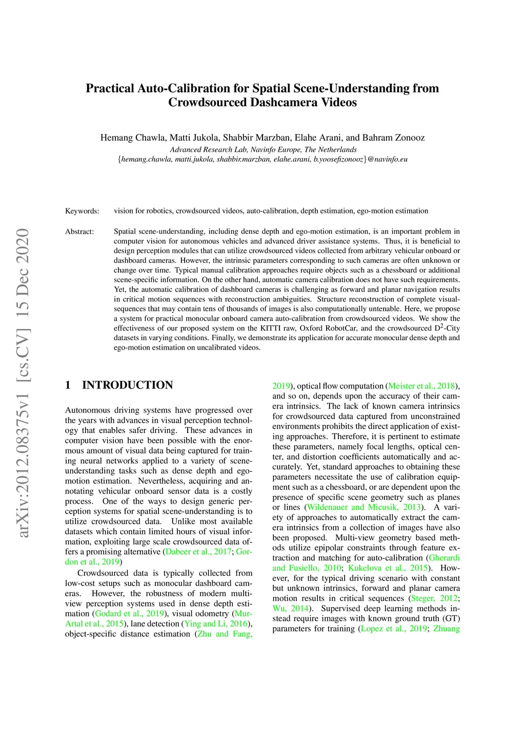Spatial scene-understanding, including dense depth and ego-motion estimation, is an important problem in computer vision for autonomous vehicles and advanced driver assistance systems. Thus, it is beneficial to design perception modules that can utilize crowdsourced videos collected from arbitrary vehicular onboard or dashboard cameras. However, the intrinsic parameters corresponding to such cameras are often unknown or change over time. Typical manual calibration approaches require objects such as a chessboard or additional scene-specific information. On the other hand, automatic camera calibration does not have such requirements. Yet, the automatic calibration of dashboard cameras is challenging as forward and planar navigation results in critical motion sequences with reconstruction ambiguities. Structure reconstruction of complete visual-sequences that may contain tens of thousands of images is also computationally untenable. Here, we propose a system for practical monocular onboard camera auto-calibration from crowdsourced videos. We show the effectiveness of our proposed system on the KITTI raw, Oxford RobotCar, and the crowdsourced D-City datasets in varying conditions. Finally, we demonstrate its application for accurate monocular dense depth and ego-motion estimation on uncalibrated videos.