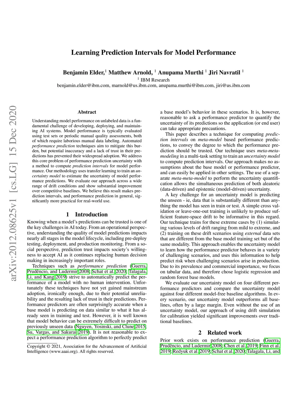 Understanding model performance on unlabeled data is a fundamental challenge of developing, deploying, and maintaining AI systems. Model performance is typically evaluated using test sets or periodic manual quality assessments, both of which require laborious manual data labeling. Automated performance prediction techniques aim to mitigate this burden, but potential inaccuracy and a lack of trust in their predictions has prevented their widespread adoption. We address this core problem of performance prediction uncertainty with a method to compute prediction intervals for model performance. Our methodology uses transfer learning to train an uncertainty model to estimate the uncertainty of model performance predictions. We evaluate our approach across a wide range of drift conditions and show substantial improvement over competitive baselines. We believe this result makes prediction intervals, and performance prediction in general, significantly more practical for real-world use.