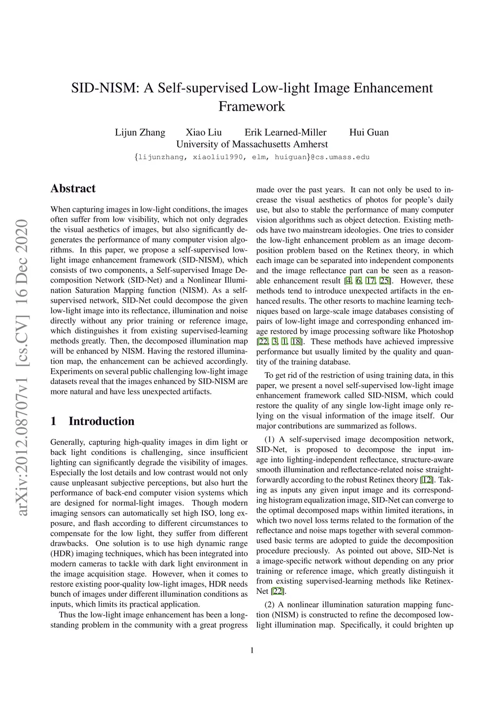 SID-NISM: A Self-supervised Low-light Image Enhancement Framework