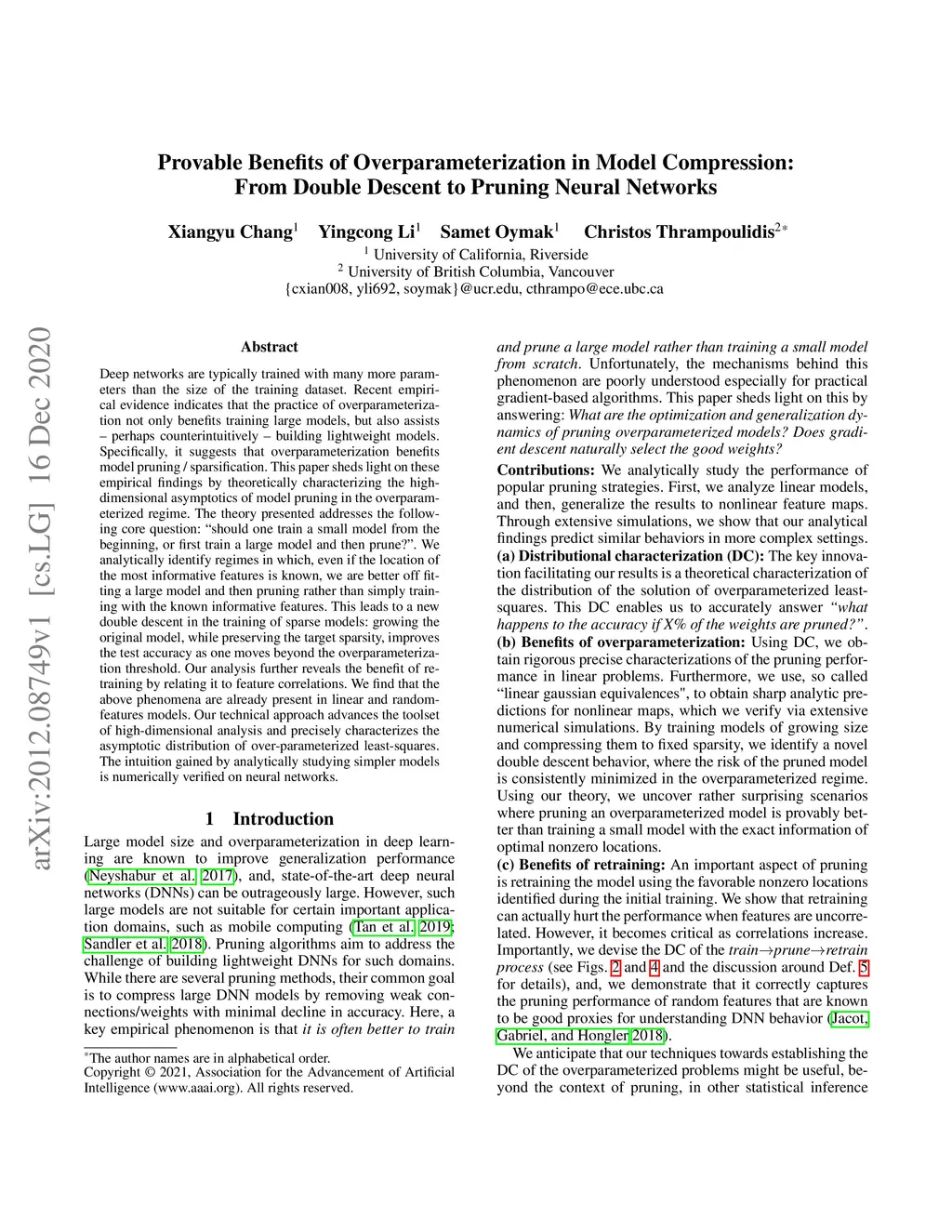 Deep networks are typically trained with many more parameters than the size of the training dataset. Recent empirical evidence indicates that the practice of overparameterization not only benefits training large models, but also assists - perhaps counterintuitively - building lightweight models. Specifically, it suggests that overparameterization benefits model pruning / sparsification. This paper sheds light on these empirical findings by theoretically characterizing the high-dimensional asymptotics of model pruning in the overparameterized regime. The theory presented addresses the following core question: "should one train a small model from the beginning, or first train a large model and then prune?". We analytically identify regimes in which, even if the location of the most informative features is known, we are better off fitting a large model and then pruning rather than simply training with the known informative features. This leads to a new double descent in the training of sparse models: growing the original model, while preserving the target sparsity, improves the test accuracy as one moves beyond the overparameterization threshold. Our analysis further reveals the benefit of retraining by relating it to feature correlations. We find that the above phenomena are already present in linear and random-features models. Our technical approach advances the toolset of high-dimensional analysis and precisely characterizes the asymptotic distribution of over-parameterized least-squares. The intuition gained by analytically studying simpler models is numerically verified on neural networks.