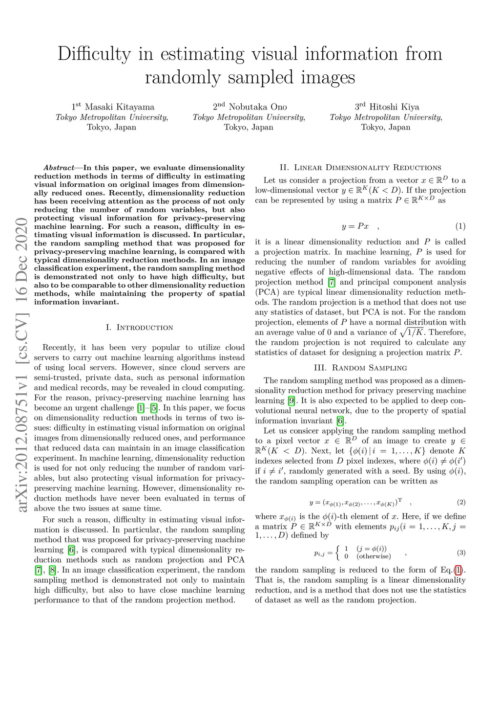 In this paper, we evaluate dimensionality reduction methods in terms of difficulty in estimating visual information on original images from dimensionally reduced ones. Recently, dimensionality reduction has been receiving attention as the process of not only reducing the number of random variables, but also protecting visual information for privacy-preserving machine learning. For such a reason, difficulty in estimating visual information is discussed. In particular, the random sampling method that was proposed for privacy-preserving machine learning, is compared with typical dimensionality reduction methods. In an image classification experiment, the random sampling method is demonstrated not only to have high difficulty, but also to be comparable to other dimensionality reduction methods, while maintaining the property of spatial information invariant.