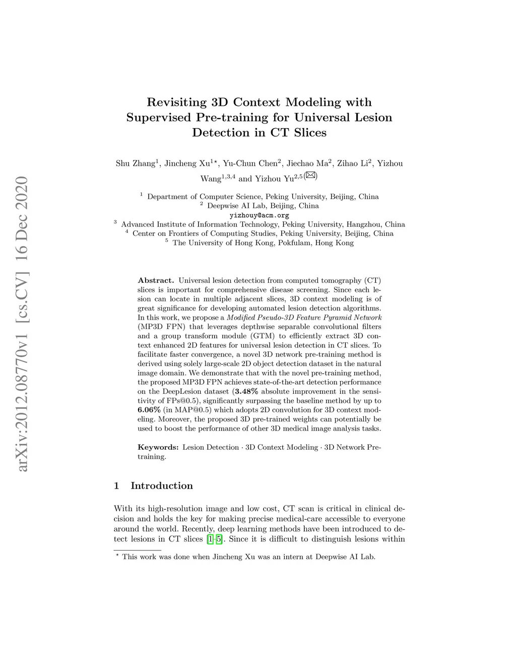 Universal lesion detection from computed tomography (CT) slices is important for comprehensive disease screening. Since each lesion can locate in multiple adjacent slices, 3D context modeling is of great significance for developing automated lesion detection algorithms. In this work, we propose a Modified Pseudo-3D Feature Pyramid Network (MP3D FPN) that leverages depthwise separable convolutional filters and a group transform module (GTM) to efficiently extract 3D context enhanced 2D features for universal lesion detection in CT slices. To facilitate faster convergence, a novel 3D network pre-training method is derived using solely large-scale 2D object detection dataset in the natural image domain. We demonstrate that with the novel pre-training method, the proposed MP3D FPN achieves state-of-the-art detection performance on the DeepLesion dataset (3.48% absolute improvement in the sensitivity of FPs@0.5), significantly surpassing the baseline method by up to 6.06% (in MAP@0.5) which adopts 2D convolution for 3D context modeling. Moreover, the proposed 3D pre-trained weights can potentially be used to boost the performance of other 3D medical image analysis tasks.