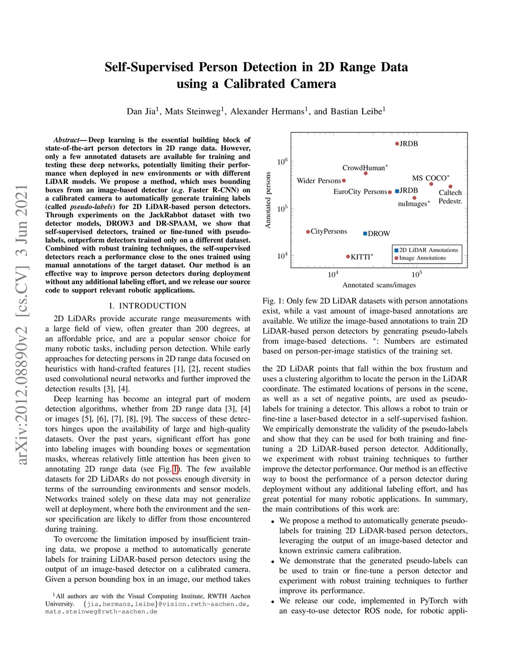 Self-Supervised Person Detection in 2D Range Data using a Calibrated