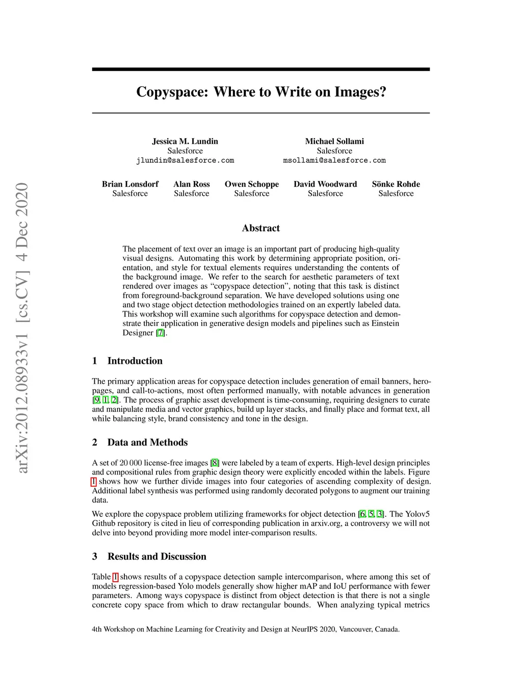 The placement of text over an image is an important part of producing high-quality visual designs. Automating this work by determining appropriate position, orientation, and style for textual elements requires understanding the contents of the background image. We refer to the search for aesthetic parameters of text rendered over images as "copyspace detection", noting that this task is distinct from foreground-background separation. We have developed solutions using one and two stage object detection methodologies trained on an expertly labeled data. This workshop will examine such algorithms for copyspace detection and demonstrate their application in generative design models and pipelines such as Einstein Designer.