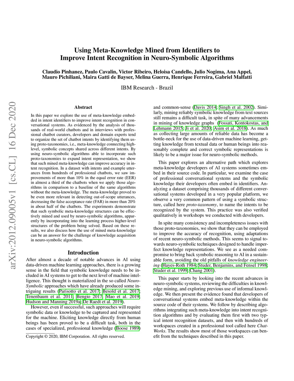 In this paper we explore the use of meta-knowledge embedded in intent identifiers to improve intent recognition in conversational systems. As evidenced by the analysis of thousands of real-world chatbots and in interviews with professional chatbot curators, developers and domain experts tend to organize the set of chatbot intents by identifying them using proto-taxonomies, i.e., meta-knowledge connecting high-level, symbolic concepts shared across different intents. By using neuro-symbolic algorithms able to incorporate such proto-taxonomies to expand intent representation, we show that such mined meta-knowledge can improve accuracy in intent recognition. In a dataset with intents and example utterances from hundreds of professional chatbots, we saw improvements of more than 10% in the equal error rate (EER) in almost a third of the chatbots when we apply those algorithms in comparison to a baseline of the same algorithms without the meta-knowledge. The meta-knowledge proved to be even more relevant in detecting out-of-scope utterances, decreasing the false acceptance rate (FAR) in more than 20\% in about half of the chatbots. The experiments demonstrate that such symbolic meta-knowledge structures can be effectively mined and used by neuro-symbolic algorithms, apparently by incorporating into the learning process higher-level structures of the problem being solved. Based on these results, we also discuss how the use of mined meta-knowledge can be an answer for the challenge of knowledge acquisition in neuro-symbolic algorithms.