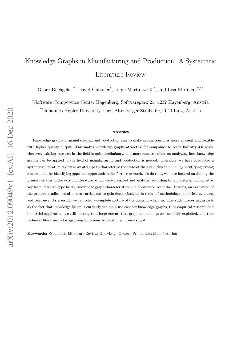 Knowledge graphs in manufacturing and production aim to make production lines more efficient and flexible with higher quality output. This makes knowledge graphs attractive for companies to reach Industry 4.0 goals. However, existing research in the field is quite preliminary, and more research effort on analyzing how knowledge graphs can be applied in the field of manufacturing and production is needed. Therefore, we have conducted a systematic literature review as an attempt to characterize the state-of-the-art in this field, i.e., by identifying exiting research and by identifying gaps and opportunities for further research. To do that, we have focused on finding the primary studies in the existing literature, which were classified and analyzed according to four criteria: bibliometric key facts, research type facets, knowledge graph characteristics, and application scenarios. Besides, an evaluation of the primary studies has also been carried out to gain deeper insights in terms of methodology, empirical evidence, and relevance. As a result, we can offer a complete picture of the domain, which includes such interesting aspects as the fact that knowledge fusion is currently the main use case for knowledge graphs, that empirical research and industrial application are still missing to a large extent, that graph embeddings are not fully exploited, and that technical literature is fast-growing but seems to be still far from its peak.