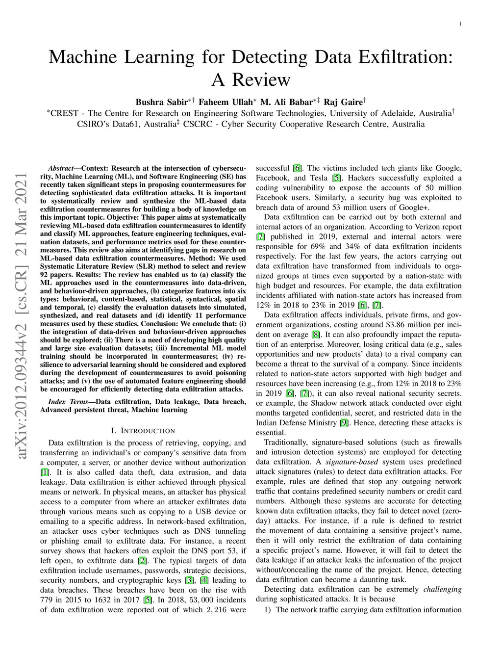 Context: Research at the intersection of cybersecurity, Machine Learning (ML), and Software Engineering (SE) has recently taken significant steps in proposing countermeasures for detecting sophisticated data exfiltration attacks. It is important to systematically review and synthesize the ML-based data exfiltration countermeasures for building a body of knowledge on this important topic. Objective: This paper aims at systematically reviewing ML-based data exfiltration countermeasures to identify and classify ML approaches, feature engineering techniques, evaluation datasets, and performance metrics used for these countermeasures. This review also aims at identifying gaps in research on ML-based data exfiltration countermeasures. Method: We used a Systematic Literature Review (SLR) method to select and review {92} papers. Results: The review has enabled us to (a) classify the ML approaches used in the countermeasures into data-driven, and behaviour-driven approaches, (b) categorize features into six types: behavioural, content-based, statistical, syntactical, spatial and temporal, (c) classify the evaluation datasets into simulated, synthesized, and real datasets and (d) identify 11 performance measures used by these studies. Conclusion: We conclude that: (i) the integration of data-driven and behaviour-driven approaches should be explored; (ii) There is a need of developing high quality and large size evaluation datasets; (iii) Incremental ML model training should be incorporated in countermeasures; (iv) resilience to adversarial learning should be considered and explored during the development of countermeasures to avoid poisoning attacks; and (v) the use of automated feature engineering should be encouraged for efficiently detecting data exfiltration attacks.