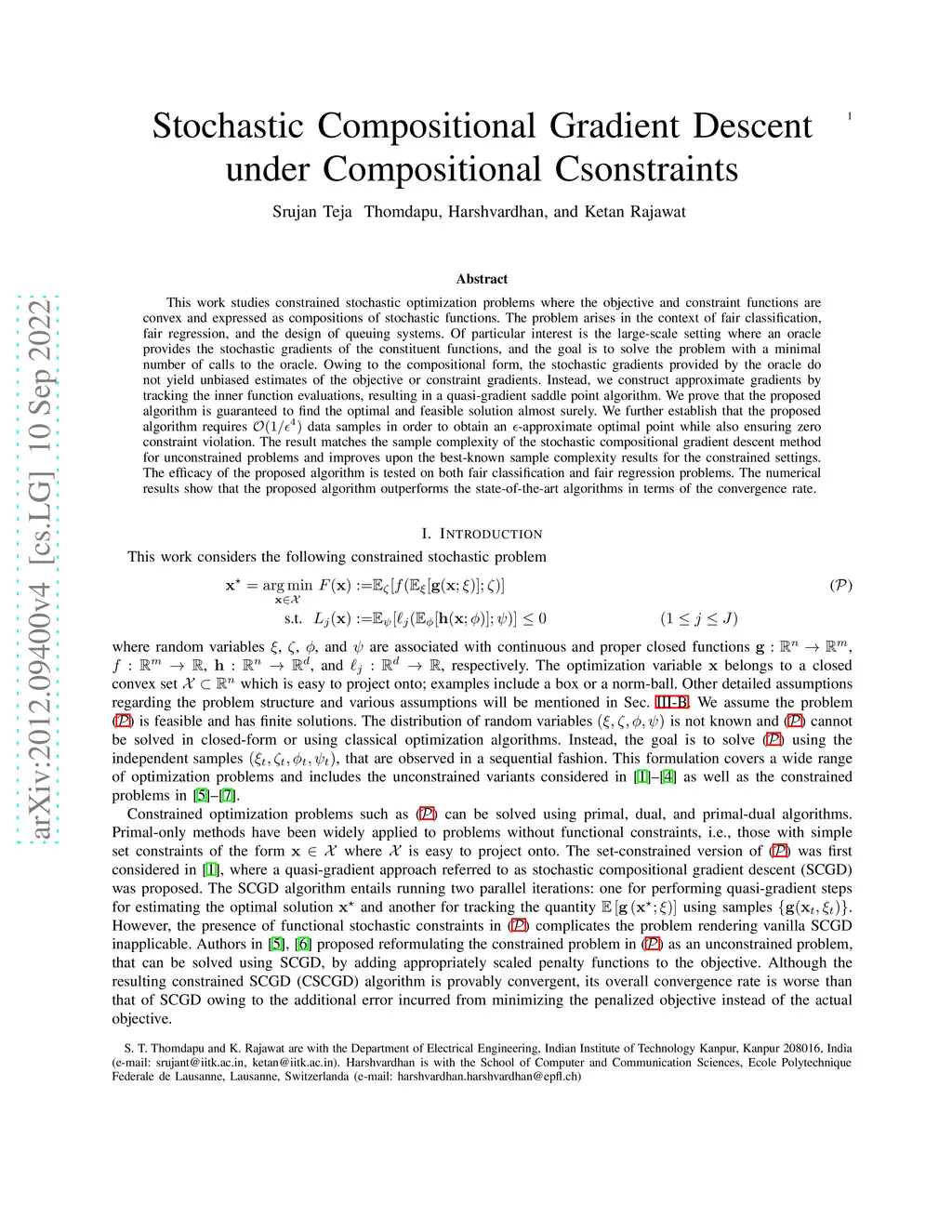 This work studies constrained stochastic optimization problems where the objective and constraint functions are convex and expressed as compositions of stochastic functions. The problem arises in the context of fair classification, fair regression, and the design of queuing systems. Of particular interest is the large-scale setting where an oracle provides the stochastic gradients of the constituent functions, and the goal is to solve the problem with a minimal number of calls to the oracle. Owing to the compositional form, the stochastic gradients provided by the oracle do not yield unbiased estimates of the objective or constraint gradients. Instead, we construct approximate gradients by tracking the inner function evaluations, resulting in a quasi-gradient saddle point algorithm. We prove that the proposed algorithm is guaranteed to find the optimal and feasible solution almost surely. We further establish that the proposed algorithm requires data samples in order to obtain an -approximate optimal point while also ensuring zero constraint violation. The result matches the sample complexity of the stochastic compositional gradient descent method for unconstrained problems and improves upon the best-known sample complexity results for the constrained settings. The efficacy of the proposed algorithm is tested on both fair classification and fair regression problems. The numerical results show that the proposed algorithm outperforms the state-of-the-art algorithms in terms of the convergence rate.