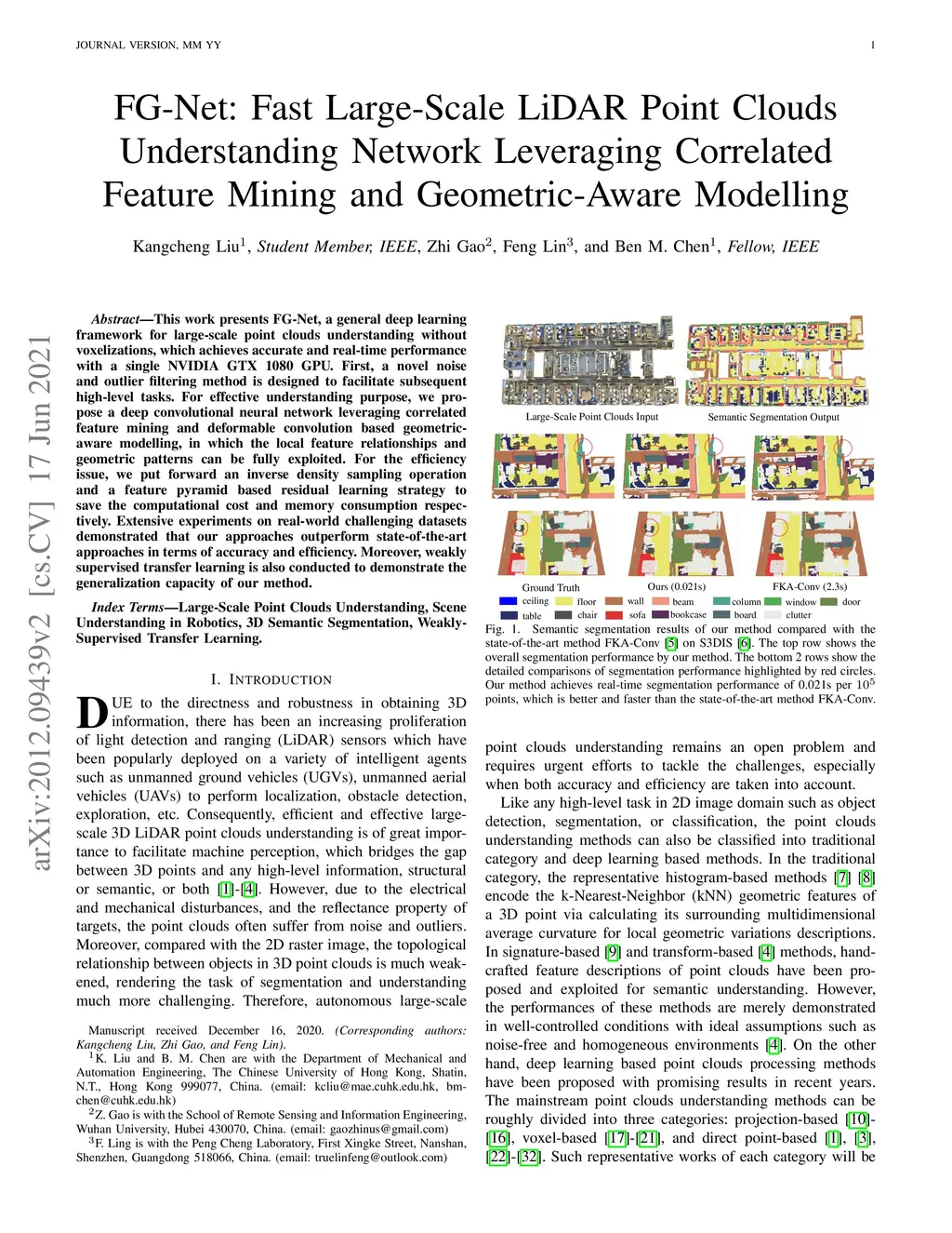 This work presents FG-Net, a general deep learning framework for large-scale point clouds understanding without voxelizations, which achieves accurate and real-time performance with a single NVIDIA GTX 1080 GPU. First, a novel noise and outlier filtering method is designed to facilitate subsequent high-level tasks. For effective understanding purpose, we propose a deep convolutional neural network leveraging correlated feature mining and deformable convolution based geometric-aware modelling, in which the local feature relationships and geometric patterns can be fully exploited. For the efficiency issue, we put forward an inverse density sampling operation and a feature pyramid based residual learning strategy to save the computational cost and memory consumption respectively. Extensive experiments on real-world challenging datasets demonstrated that our approaches outperform state-of-the-art approaches in terms of accuracy and efficiency. Moreover, weakly supervised transfer learning is also conducted to demonstrate the generalization capacity of our method.