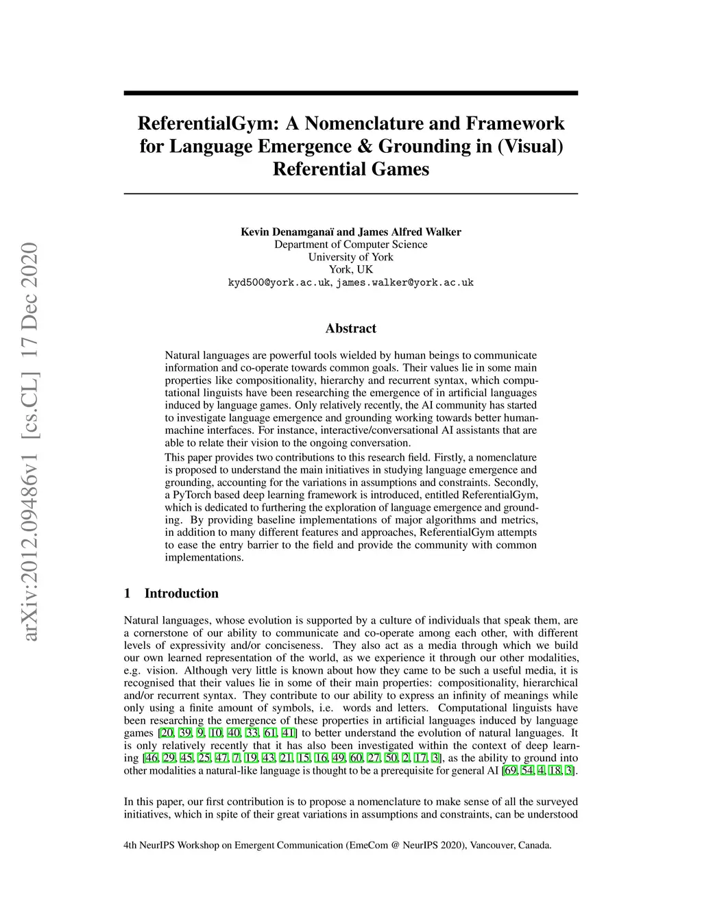 ReferentialGym: A Nomenclature and Framework for Language Emergence &