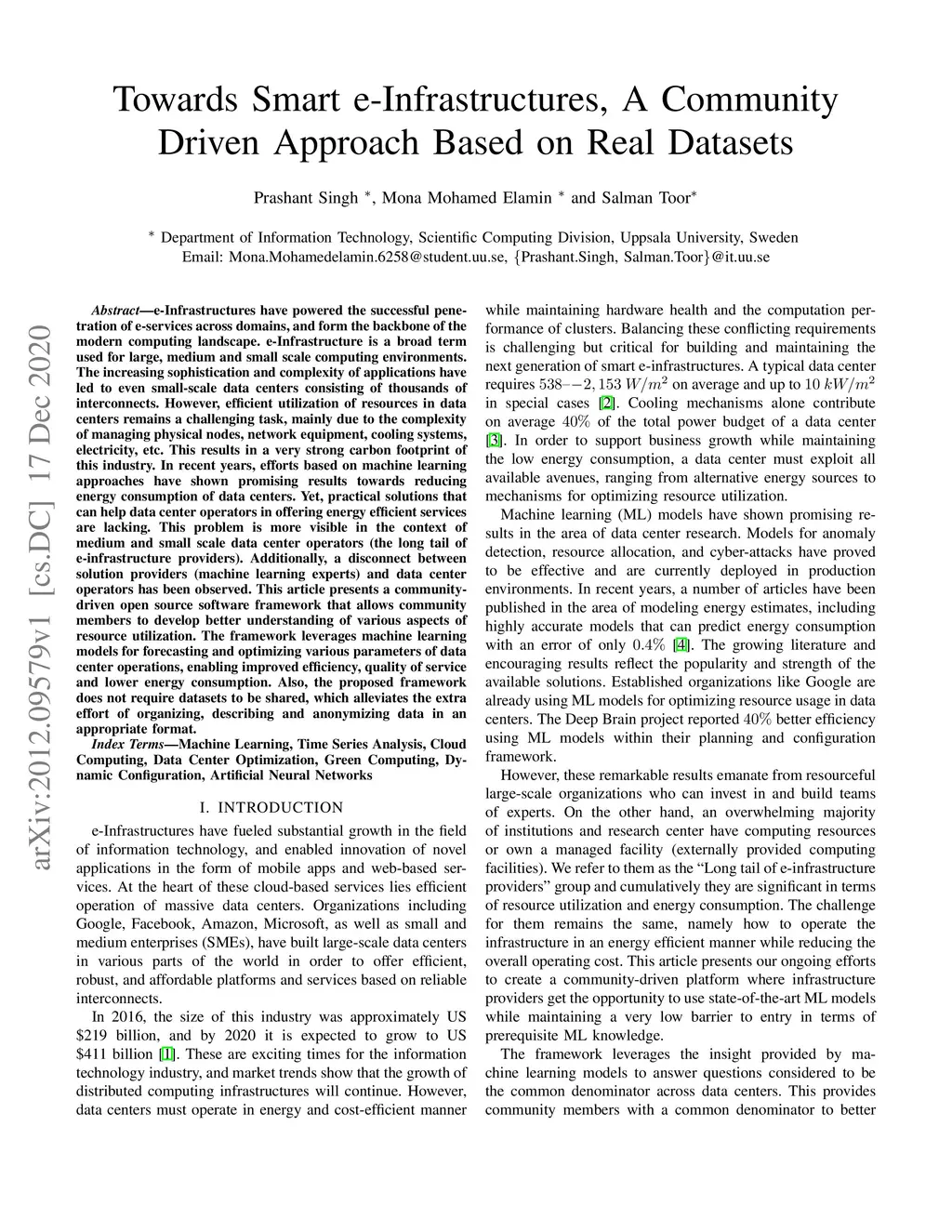 e-Infrastructures have powered the successful penetration of e-services across domains, and form the backbone of the modern computing landscape. e-Infrastructure is a broad term used for large, medium and small scale computing environments. The increasing sophistication and complexity of applications have led to even small-scale data centers consisting of thousands of interconnects. However, efficient utilization of resources in data centers remains a challenging task, mainly due to the complexity of managing physical nodes, network equipment, cooling systems, electricity, etc. This results in a very strong carbon footprint of this industry. In recent years, efforts based on machine learning approaches have shown promising results towards reducing energy consumption of data centers. Yet, practical solutions that can help data center operators in offering energy efficient services are lacking. This problem is more visible in the context of medium and small scale data center operators (the long tail of e-infrastructure providers). Additionally, a disconnect between solution providers (machine learning experts) and data center operators has been observed. This article presents a community-driven open source software framework that allows community members to develop better understanding of various aspects of resource utilization. The framework leverages machine learning models for forecasting and optimizing various parameters of data center operations, enabling improved efficiency, quality of service and lower energy consumption. Also, the proposed framework does not require datasets to be shared, which alleviates the extra effort of organizing, describing and anonymizing data in an appropriate format.
